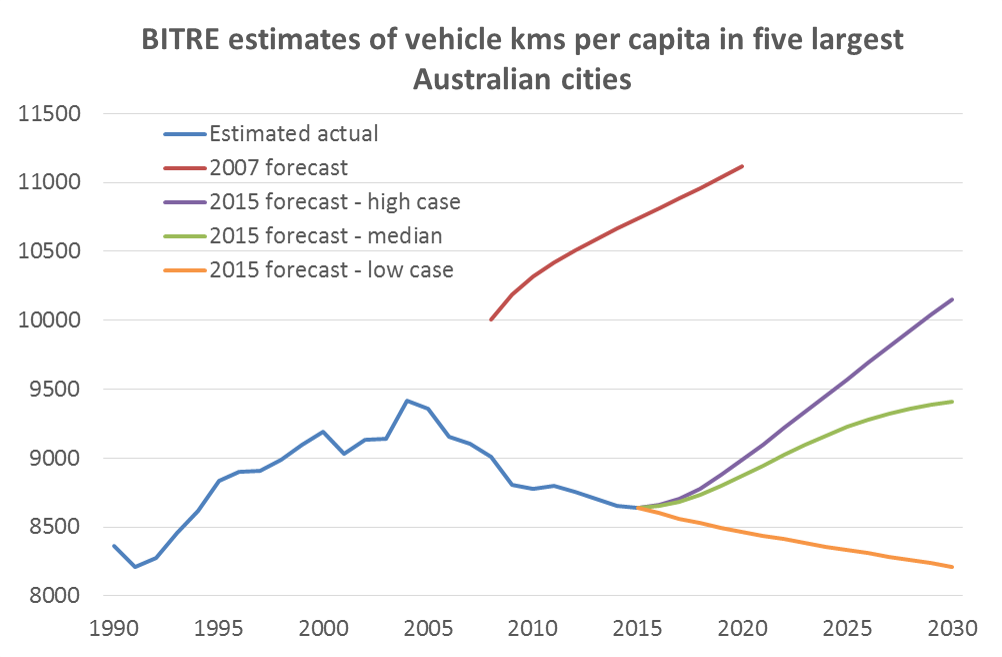 Car and transit use per capita in Australian cities (Peak Car) » BITRE vkms per capita estimates