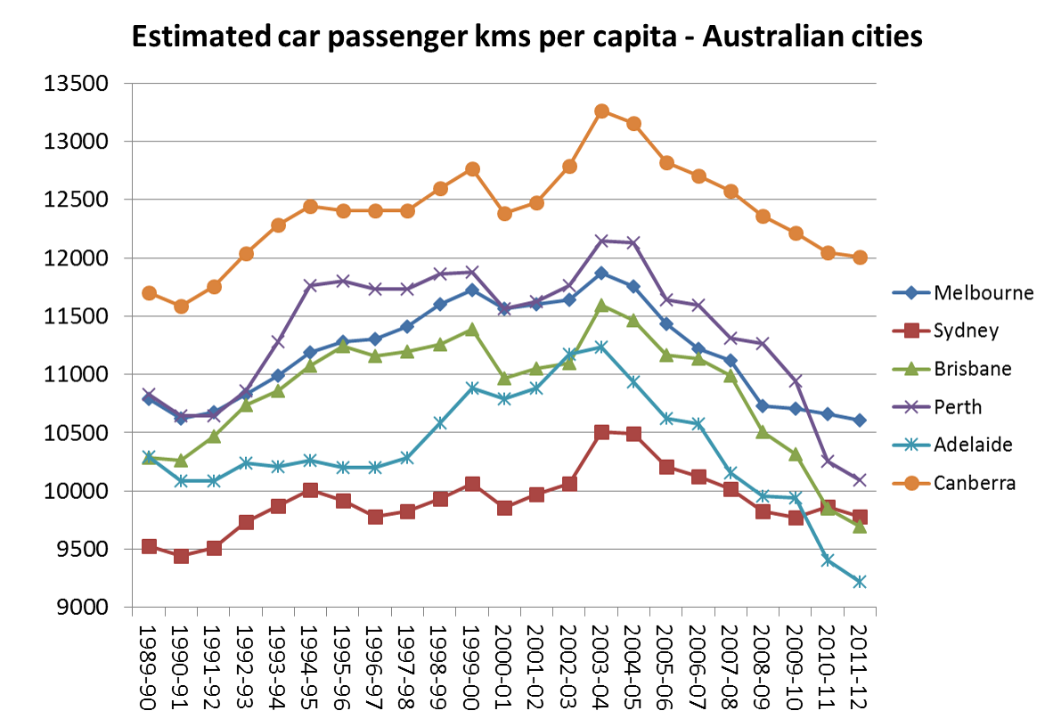 Car and transit use per capita in Australian cities (Peak Car) » car pass kms per capita 2