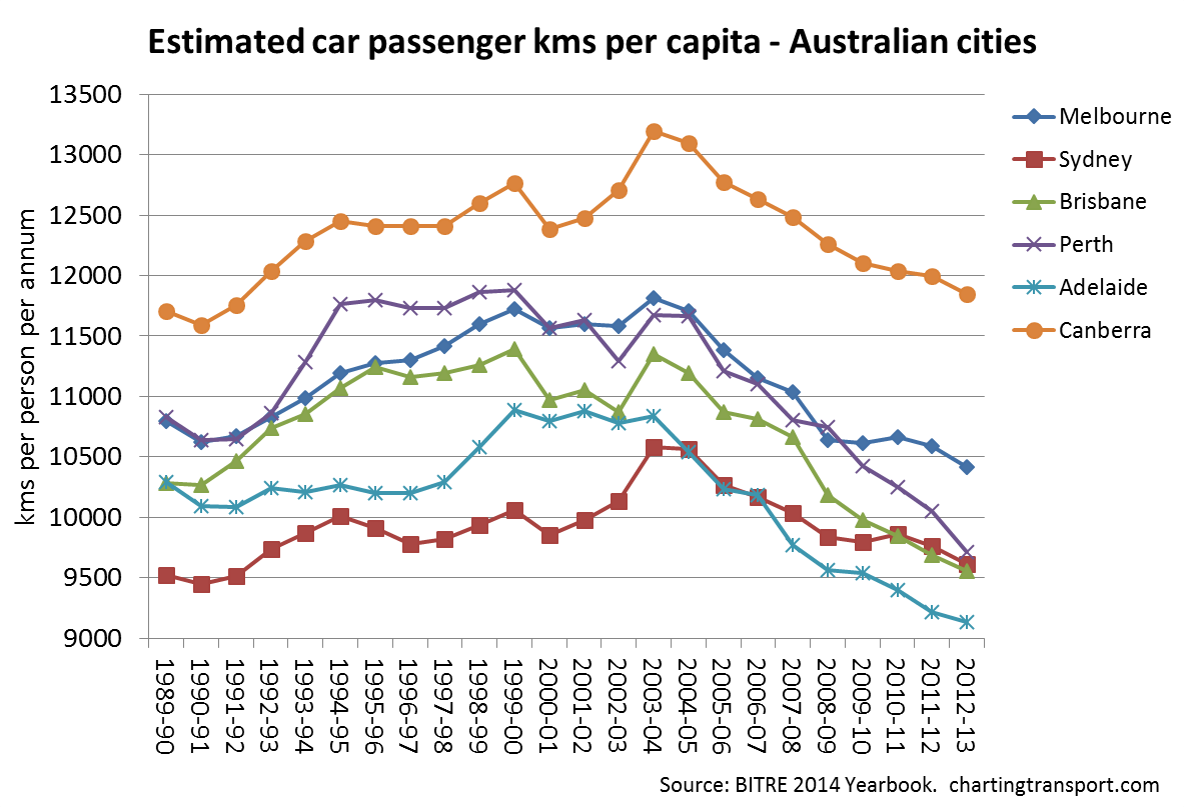 Car and transit use per capita in Australian cities (Peak Car) » car pass kms per capita 3