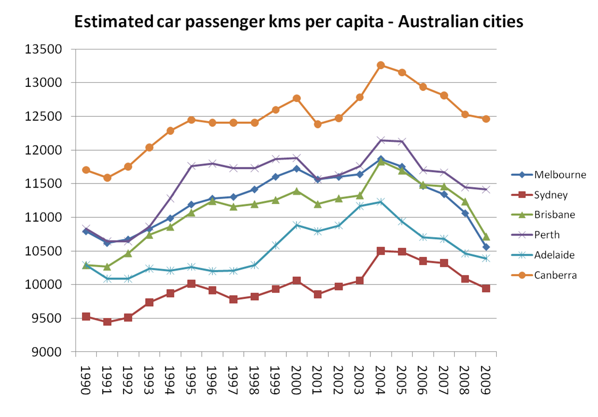 Car and transit use per capita in Australian cities (Peak Car) » car passenger kms per capita