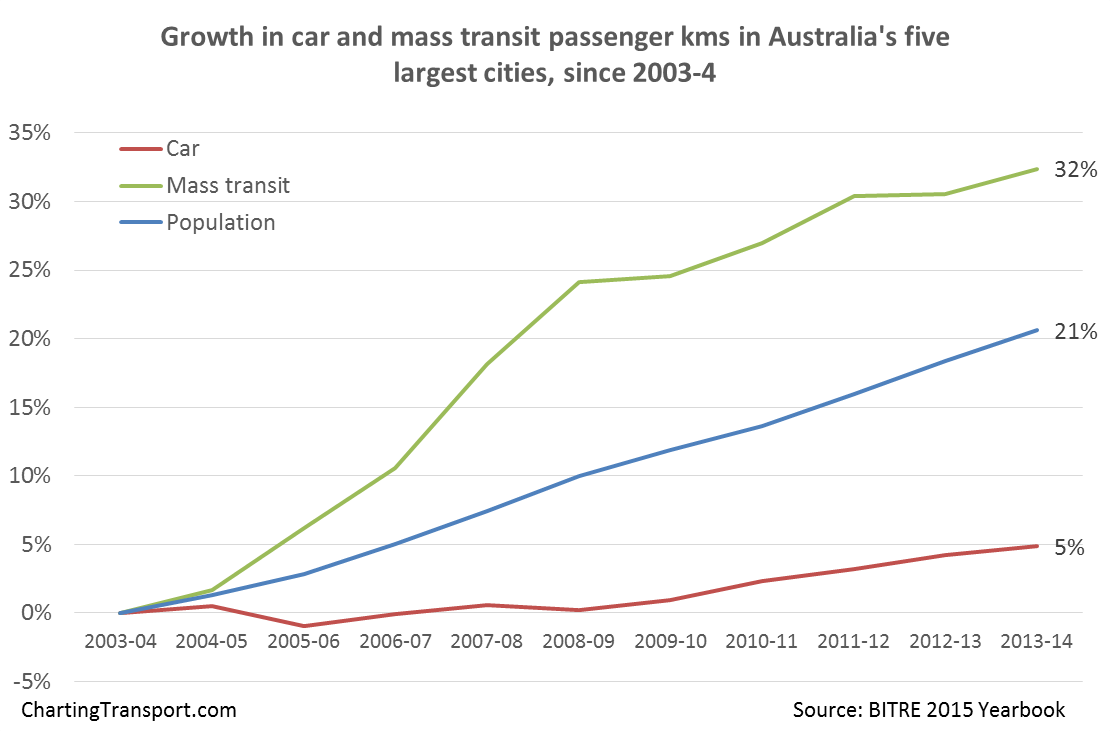 Car and transit use per capita in Australian cities (Peak Car) » car v pt growth aus large cities 2