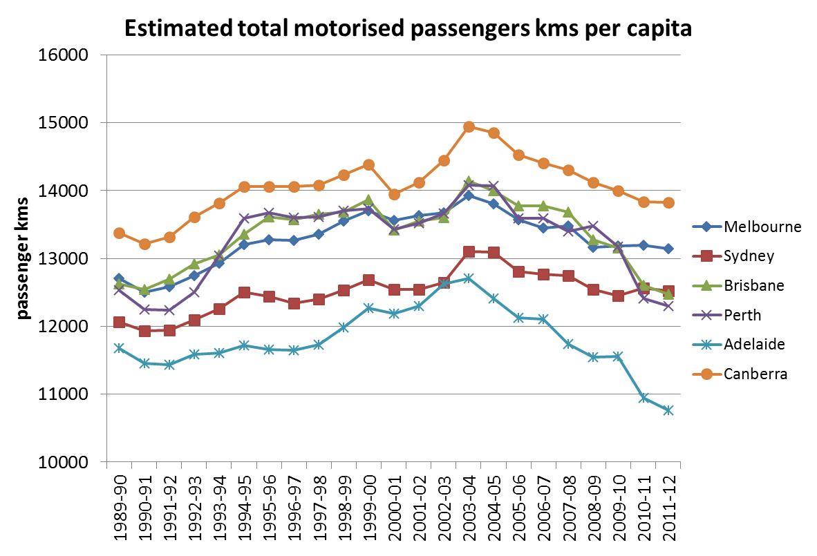 Car and transit use per capita in Australian cities (Peak Car) » motorised pass kms per capita 2