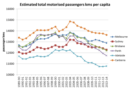 Car and transit use per capita in Australian cities (Peak Car) » motorised pass kms per capita 4
