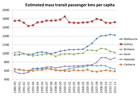 Car and transit use per capita in Australian cities (Peak Car) » PT pass kms per capita 2
