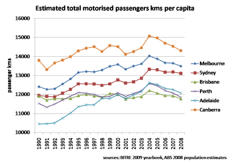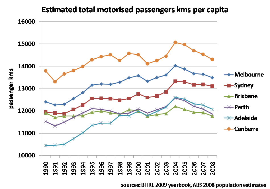 Car and transit use per capita in Australian cities (Peak Car) » Estimated total motorised passenger kms per capita