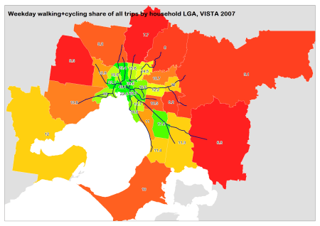 Spatial analysis of Melbourne household travel data » Weekday active mode share
