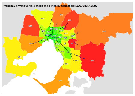 Spatial analysis of Melbourne household travel data » Weekday private vehicle mode share