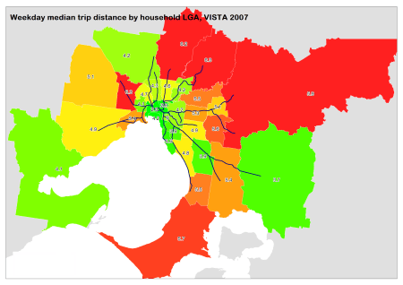 Spatial analysis of Melbourne household travel data » Weekday trip distance