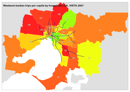 Spatial analysis of Melbourne household travel data » Weekend trips per capita