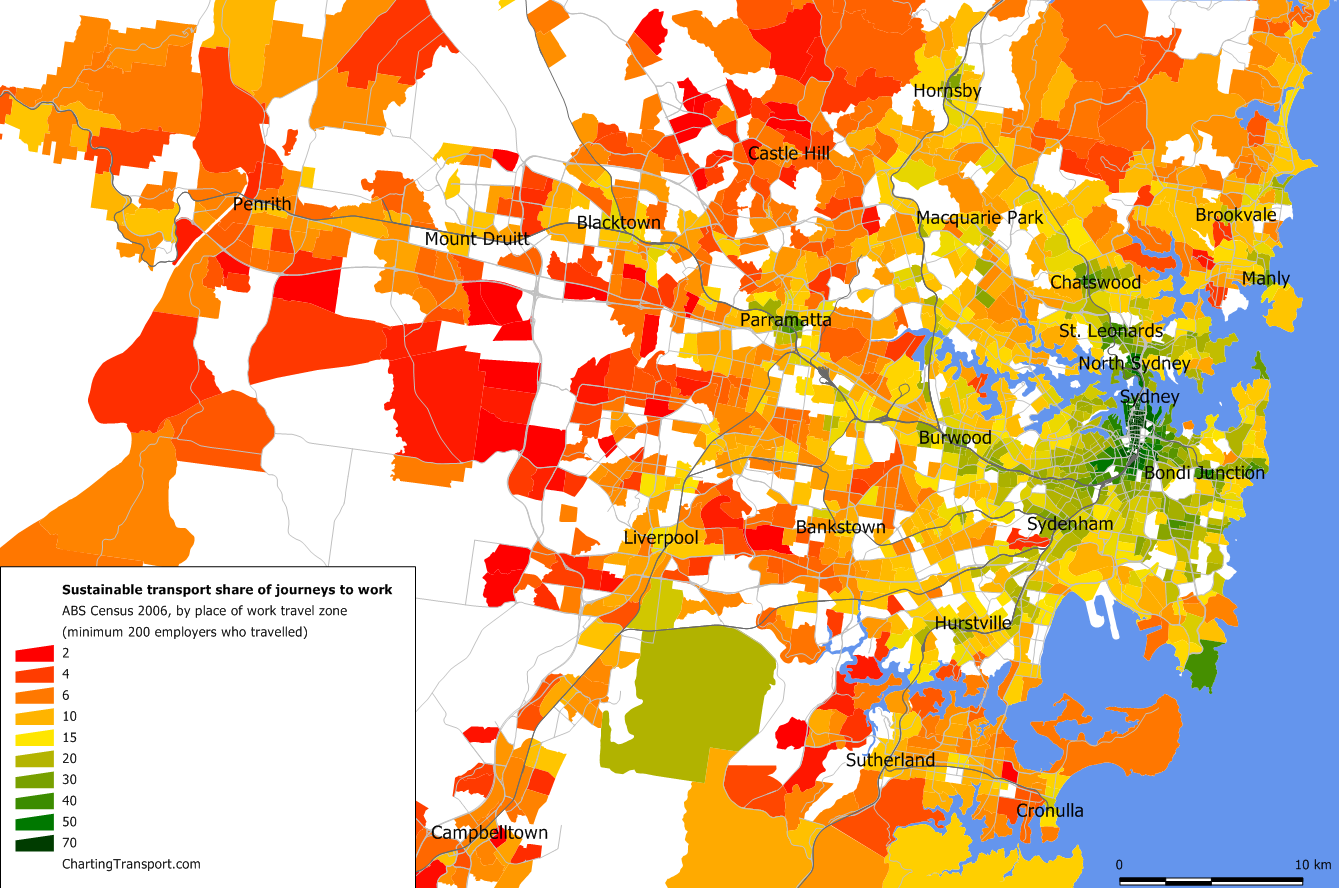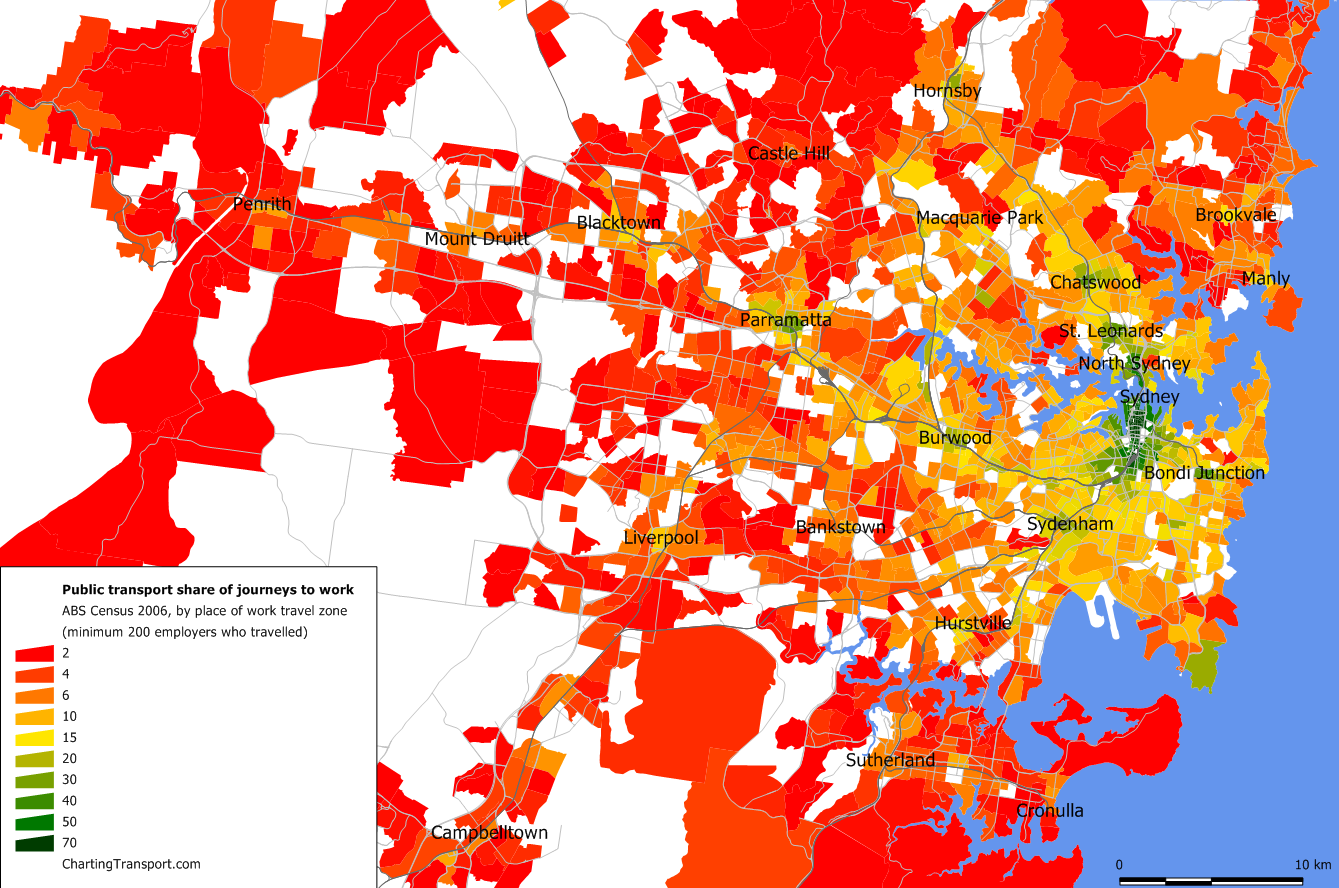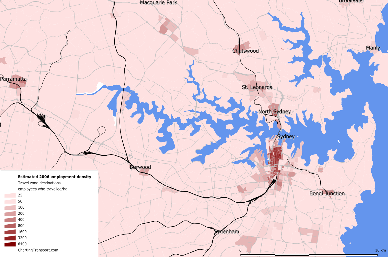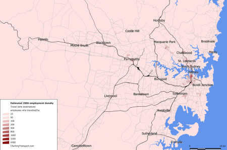 […] from various countries, then in more detail on Australian cities, and finally into great detail on just Sydney. Two maps looking at employment density and public transport use in Sydney most relevant to this […]