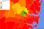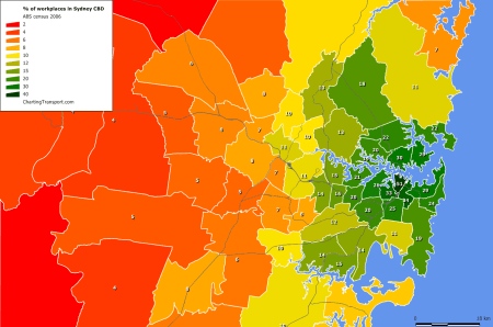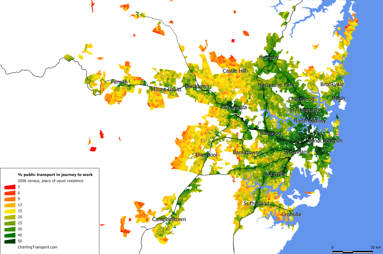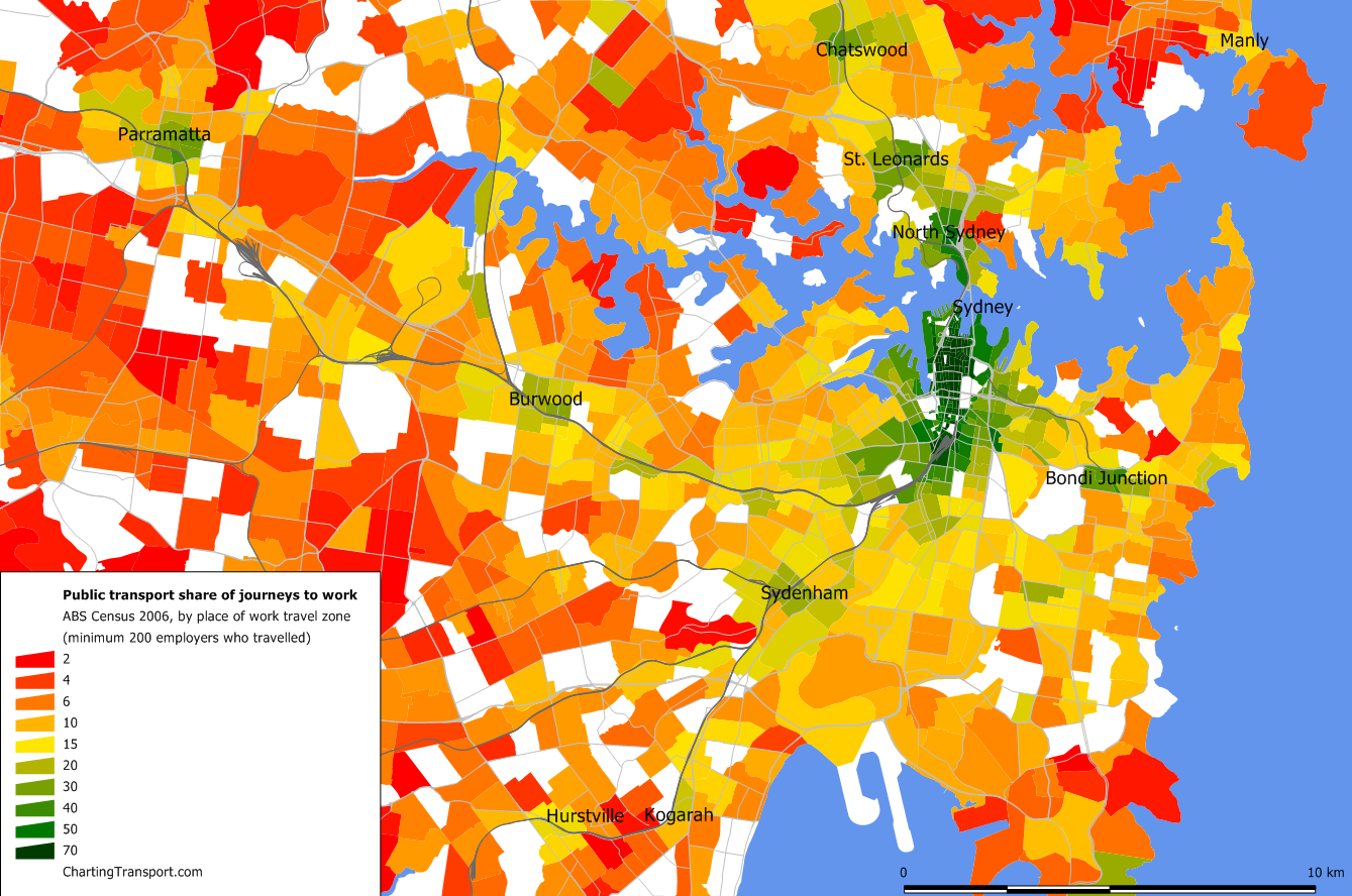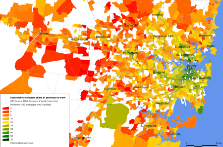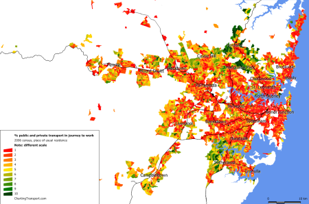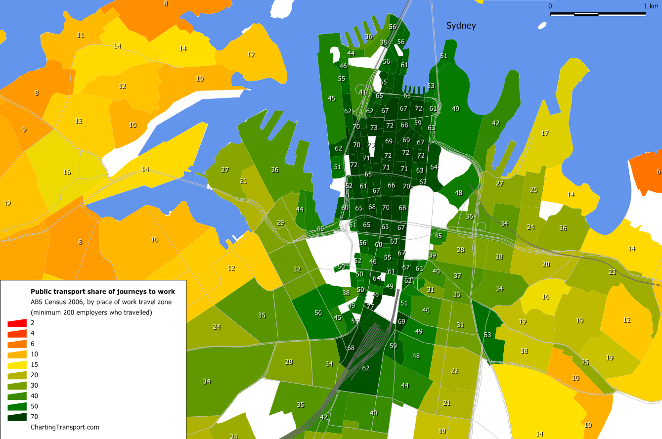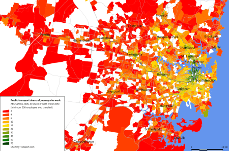 Here is a map showing the public transport mode share of journeys to travel zones in Sydney in 2006 (where 200 or more journeys were made):