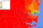 Here’s a map showing the public transport mode share by home location of journeys to work in the Sydney CBD (defined as the Sydney – inner SLA, the only red SLA on the map):