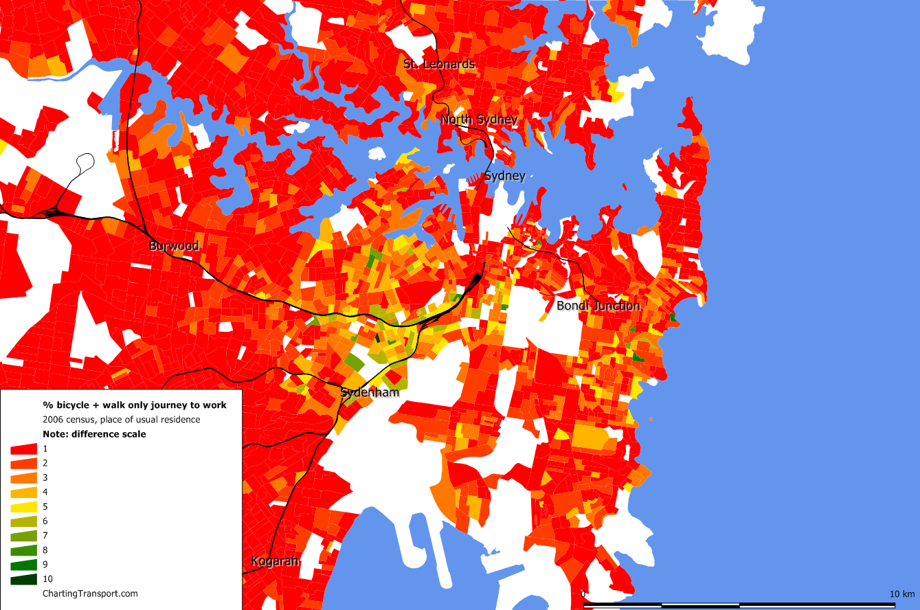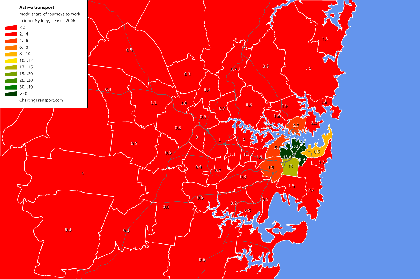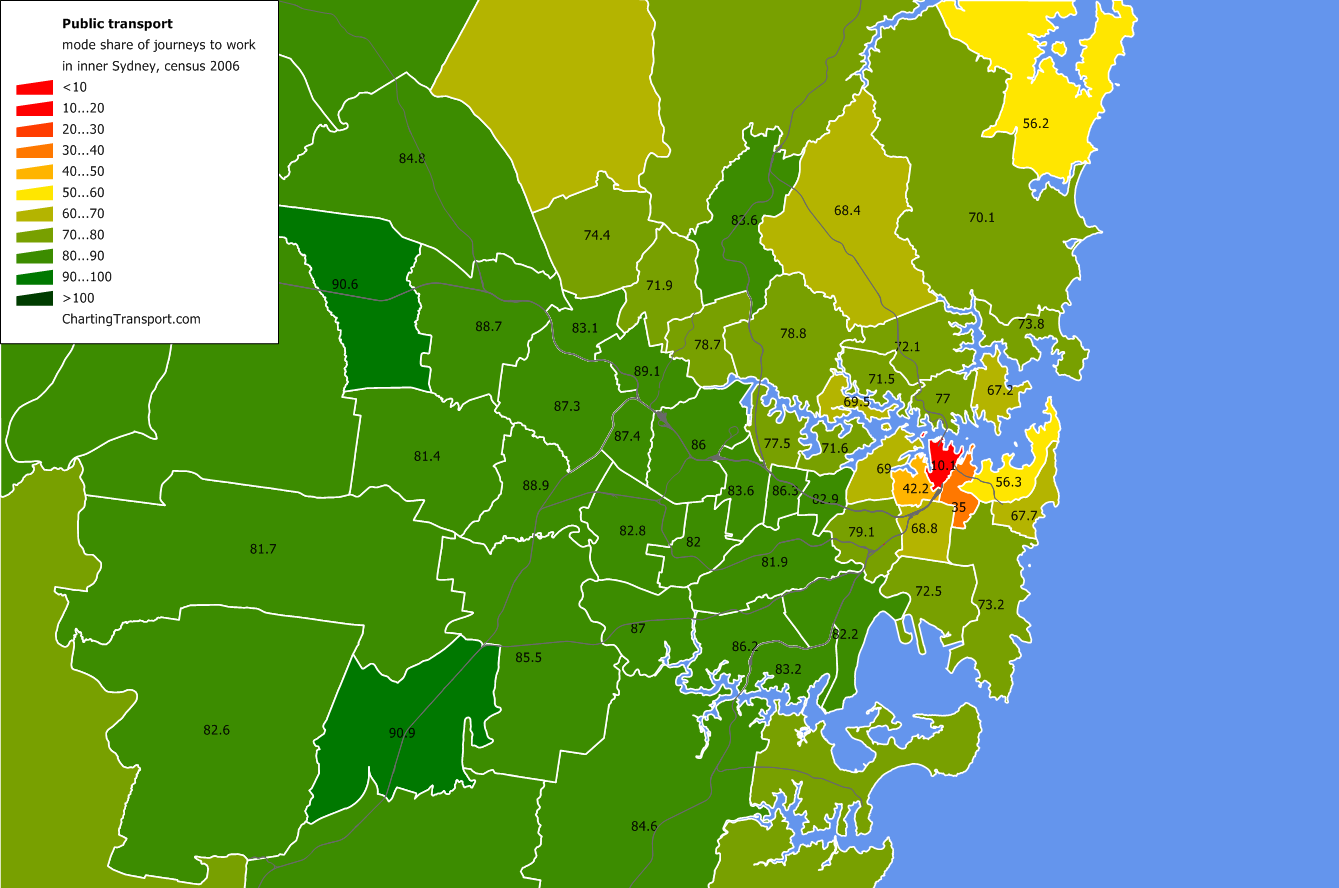 Public transport had a mode share around 70-80% for large areas of Sydney (in contrast to Melbourne where 60-70% was more common). However there was a much lower share from the CBD itself and areas adjacent.