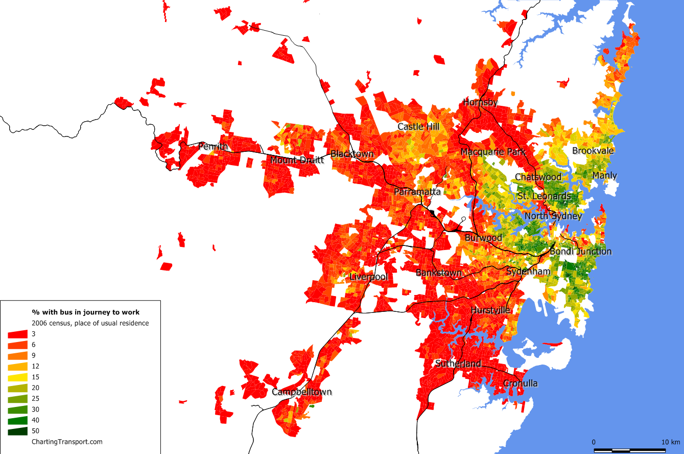 Bus mode share was high in the suburbs close to the Sydney CBD, but very low in the outer suburbs (with exceptions around Palm Beach in the north, Castle Hill (served by freeway buses), and seemingly random pockets north of Mount Druitt).