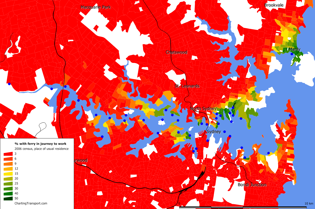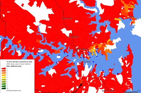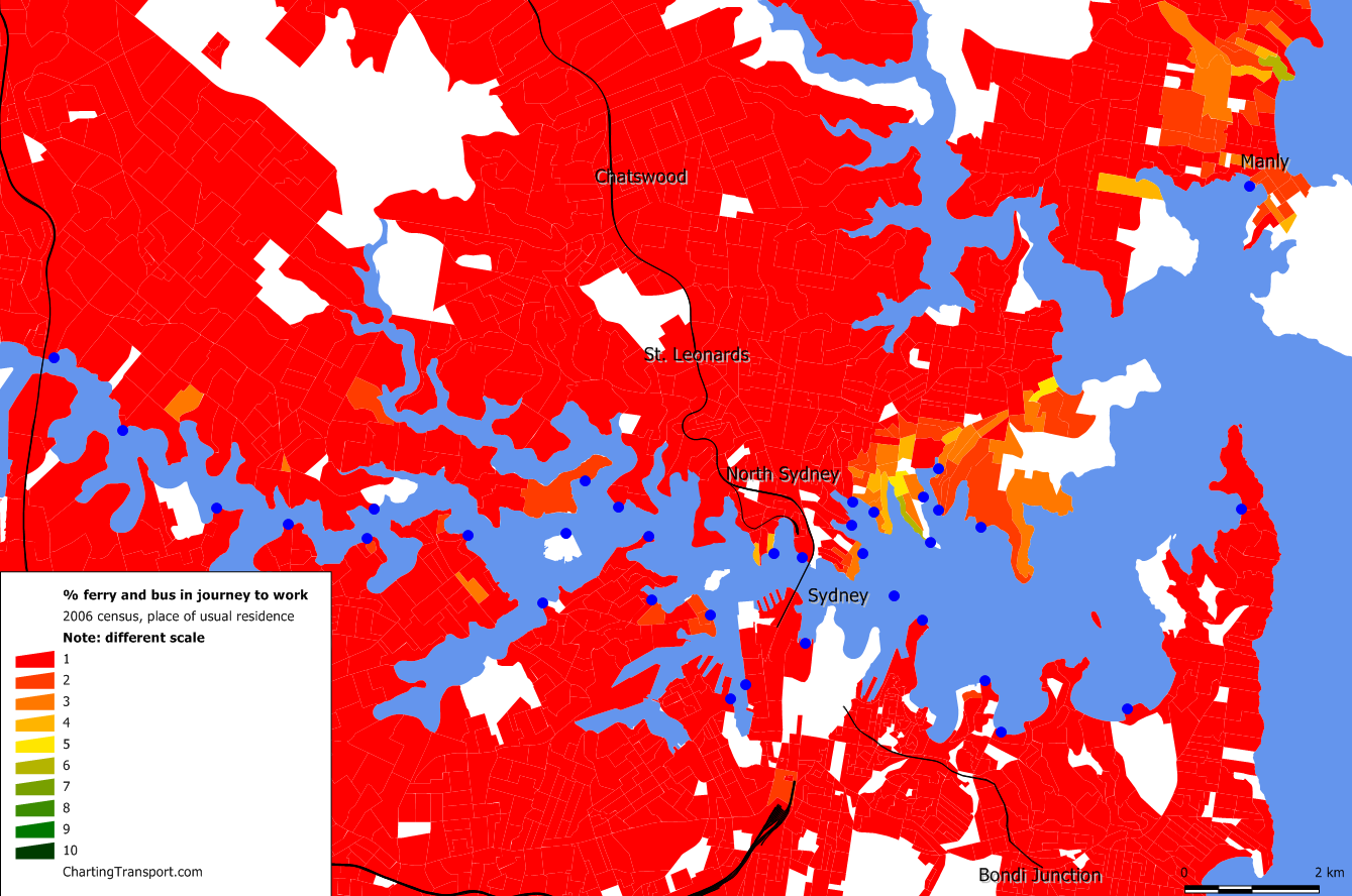 You can see high mode shares on the north shore, to the inner east, and around Manly (wharves which probably have fairly direct services to the CBD). This includes some areas a fair walk from the ferry terminals – with some people probably using connecting buses. In fact, here is a map showing bus and ferry commuters mostly on the north shore (note different colour scale):