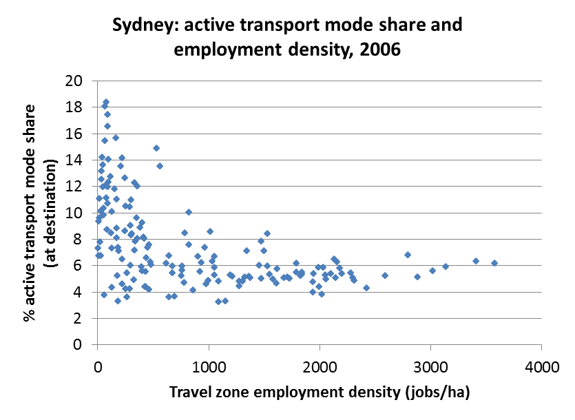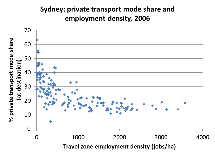 I must stress that these results will strongly reflect the design of public transport – which is heavily geared towards places with high employment density (such as the Sydney CBD) as that is where public transport can generally complete strongest with private transport (the cost of parking and traffic congestion etc). By increasing employment density in any parcel of land you won’t automatically get high public transport mode share – you have to provide high quality public transport to that destination first!