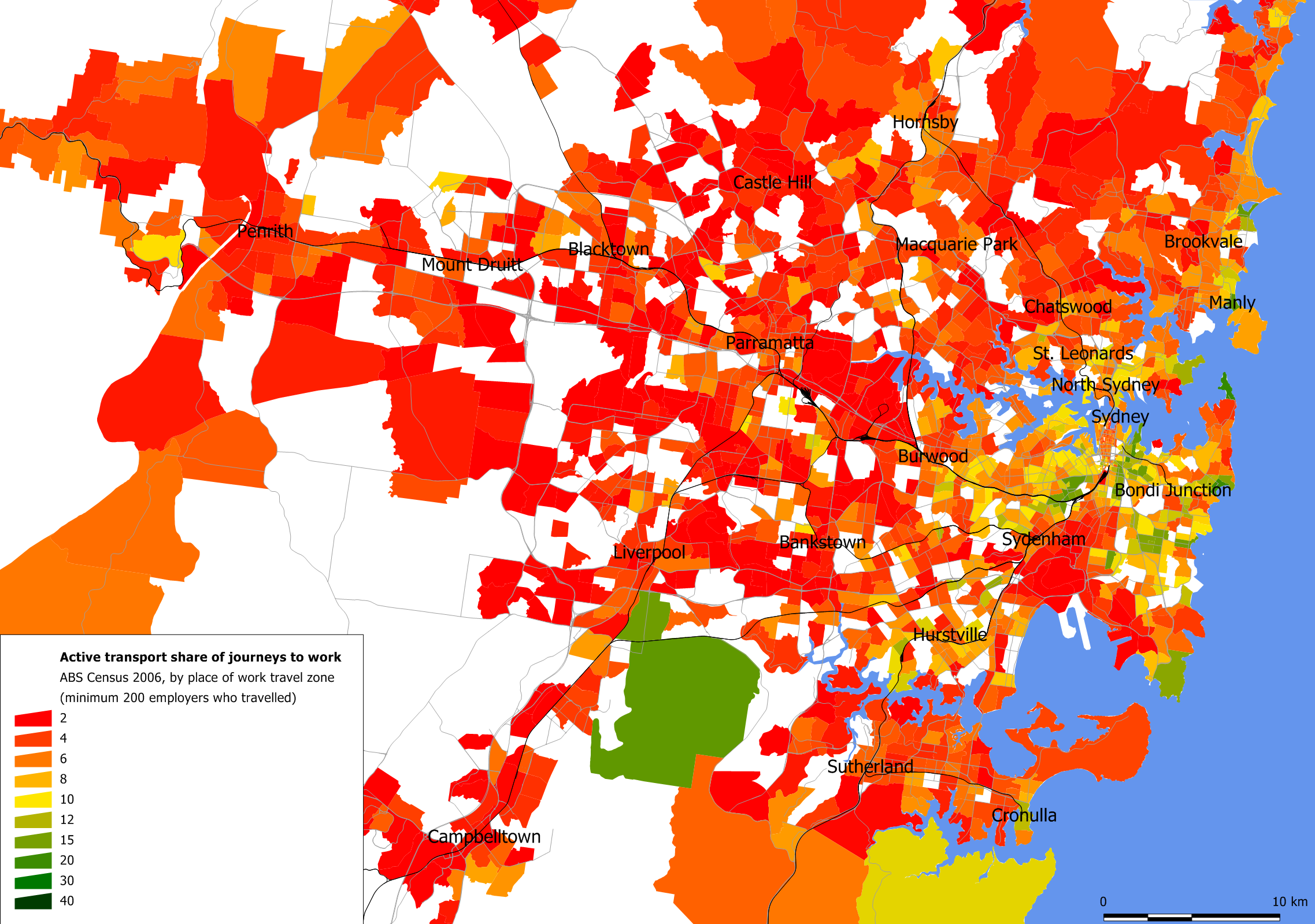 Here’s a map showing active transport mode share for greater Sydney workplace destinations: