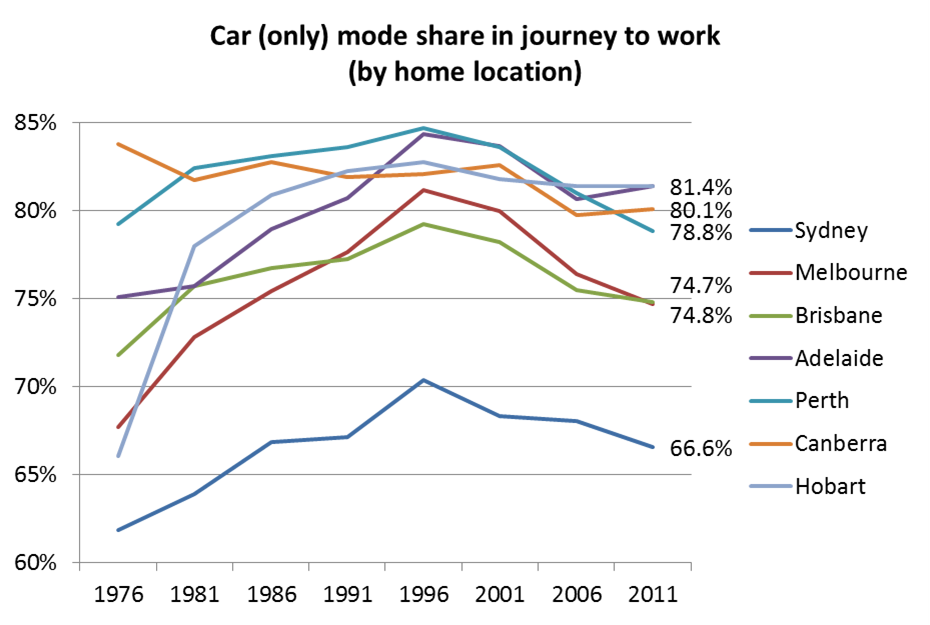 Trends in journey to work mode shares in Australian cities to 2011 » car only mode share
