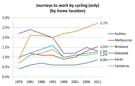Trends in journey to work mode shares in Australian cities to 2011 » cycling only mode share trend