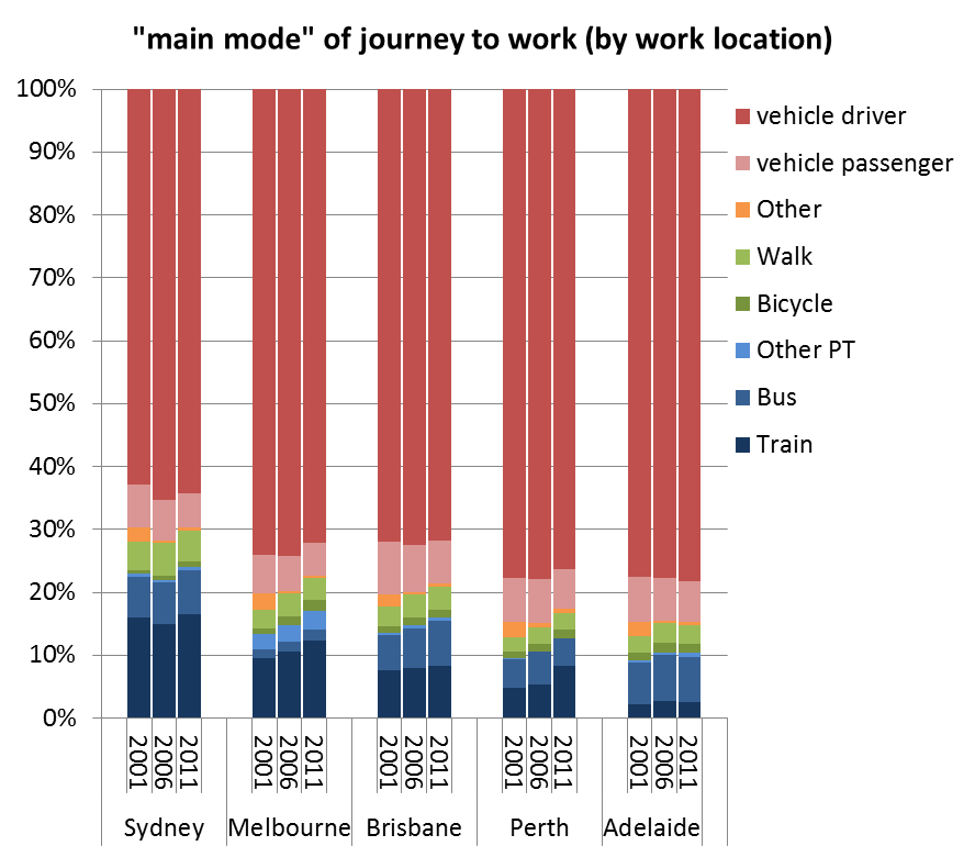 Trends in journey to work mode shares in Australian cities to 2011 » word dest mode split 2001-2011