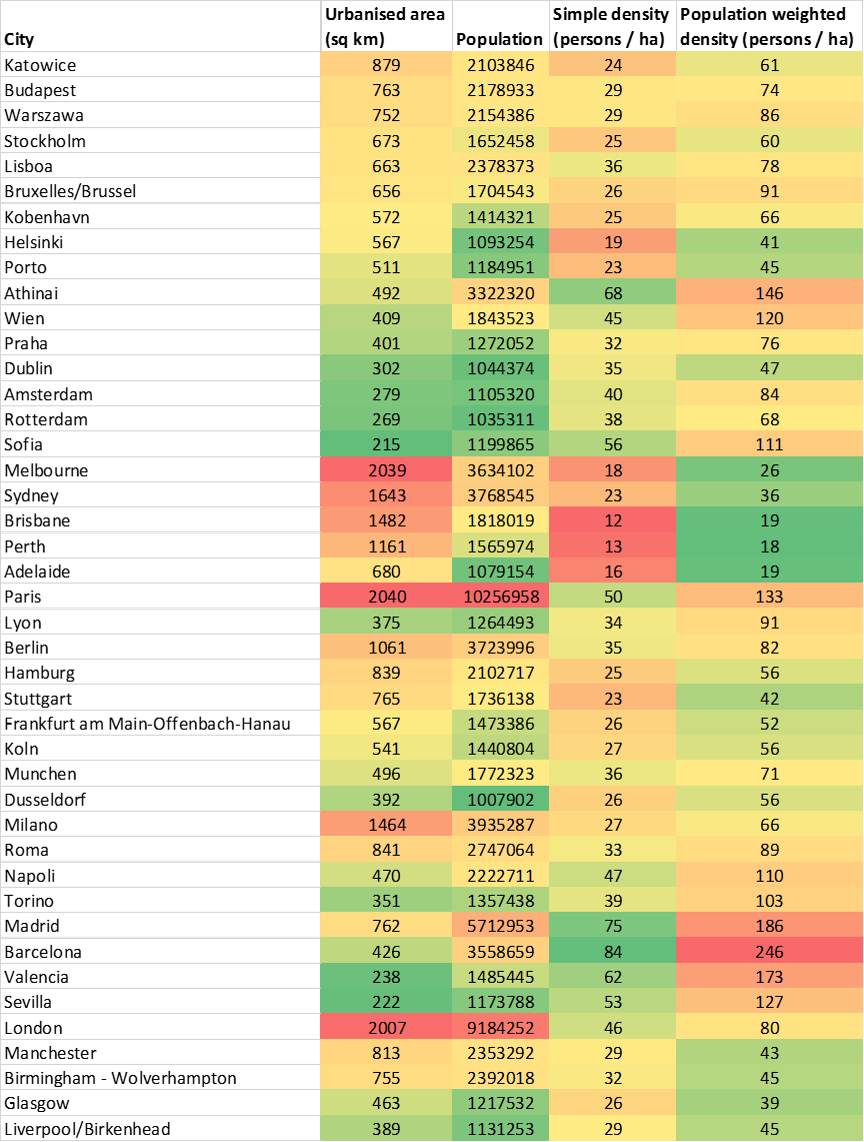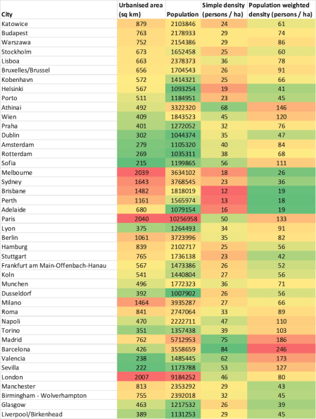 How do Australian and European cities compare for population and area? » AU EU city data table