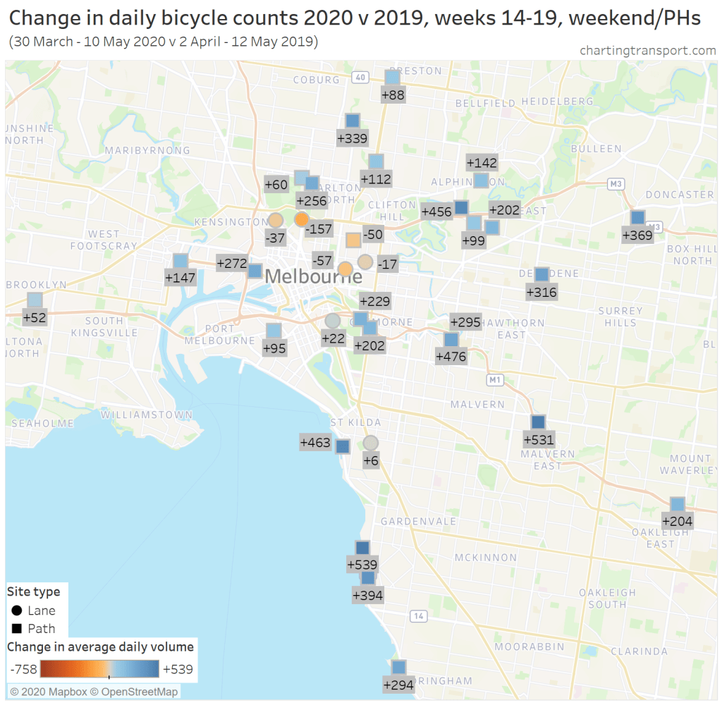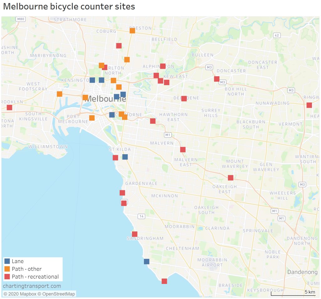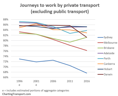 I have access to very detailed household travel survey data for my home city of Melbourne for the pre-pandemic years 2012-2018, so that’s my primary source (officially VISTA – the Victorian Integrated Survey of Travel and Activity, get data here). It covers all types of non-commercial travel by residents, on all days of the year. Of course that data is pre-COVID and things will have changed somewhat since then but rich post-COVID data is not yet available.