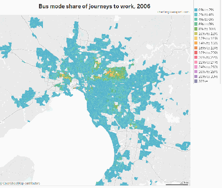 - For people who worked outside the City of Melbourne, the mode share profile across age changed significantly over time for young adults. In 2006 there was a steady decline with age, but in 2011 PT mode shares were generally flat for those in their 20s, and in 2016 PT mode shares peaked for women in their late 20s (and also had a quite new pattern for dads in their 20s).