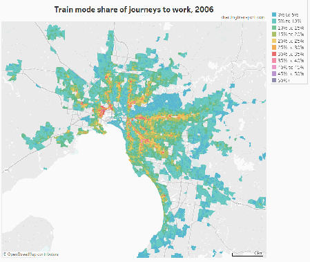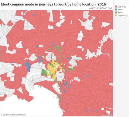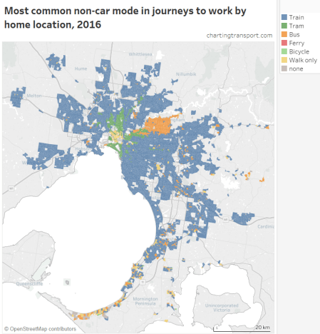 I’ve also looked at use of public transport in journeys to work for 2016. Workers can report up to three modes of travel, and I’ve extracted counts of workers who used each of the three main modes of public transport in Greater Melbourne (note: people who used multiple public transport modes will be counted in multiple columns).