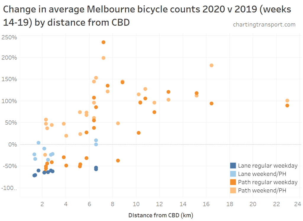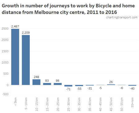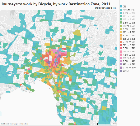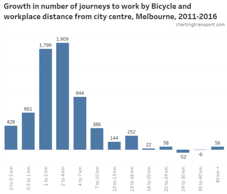 Before you get too excited about the differences, it’s worth pointing out all the proportions are small. The vast majority of people in Greater Melbourne don’t travel to central Melbourne on any given day. And of course people who lived in central Melbourne had many of their trips counted in this chart.