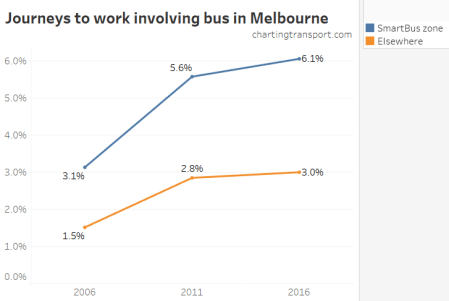 Unfortunately this data doesn’t line up with reported public transport patronage for the same time period (below), suggesting that tram travel may be under-reported in VISTA (although the above chart is filtered for persons aged 20-64):