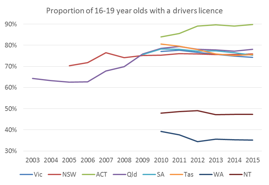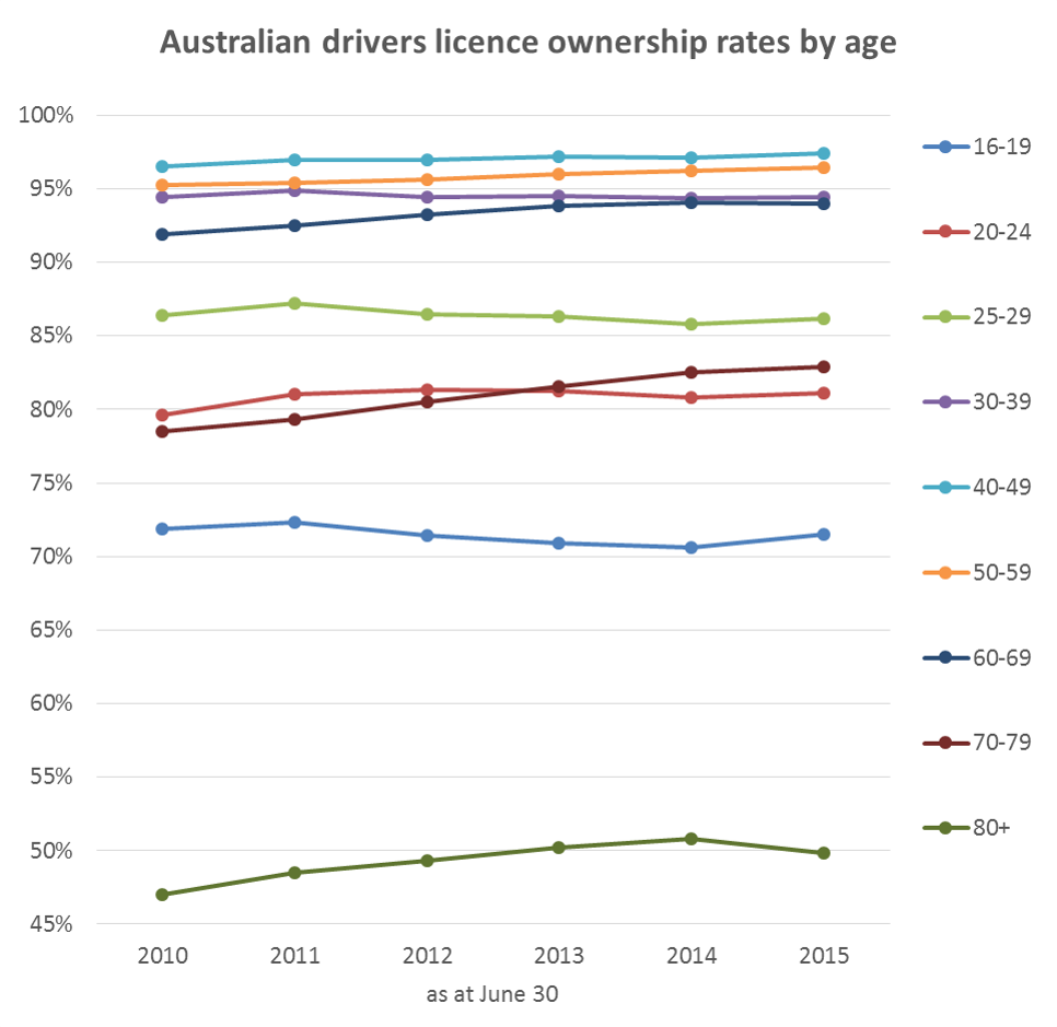 Consistent with VISTA, data from the BITRE yearbooks also shows that younger adults have become less likely to own a licence over time: