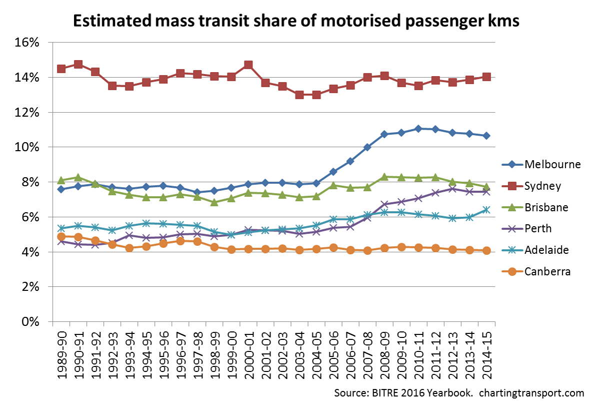 Public transport mode shares are also related to both motor vehicle ownership and home distance from the CBD: