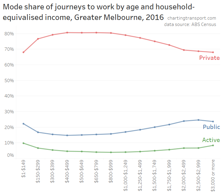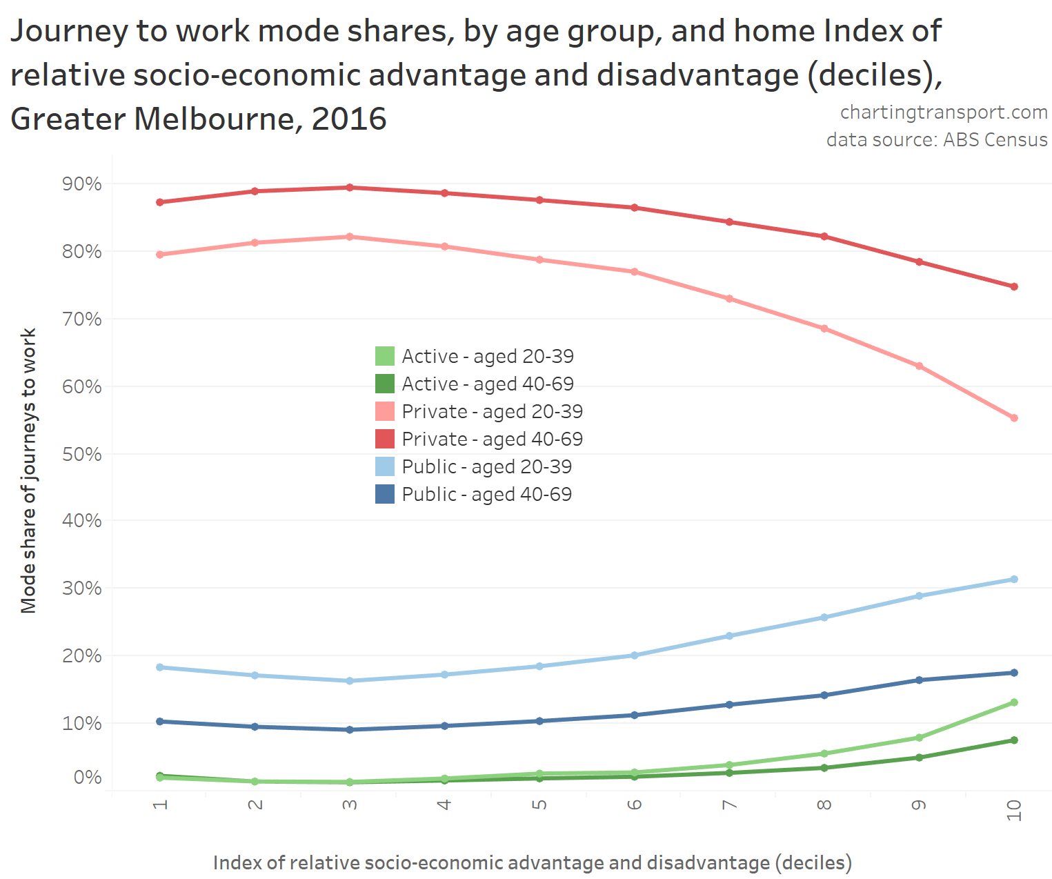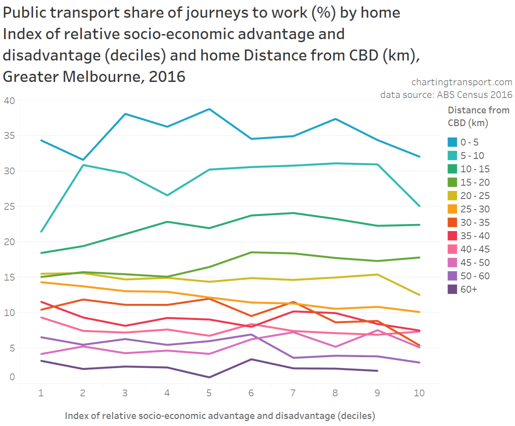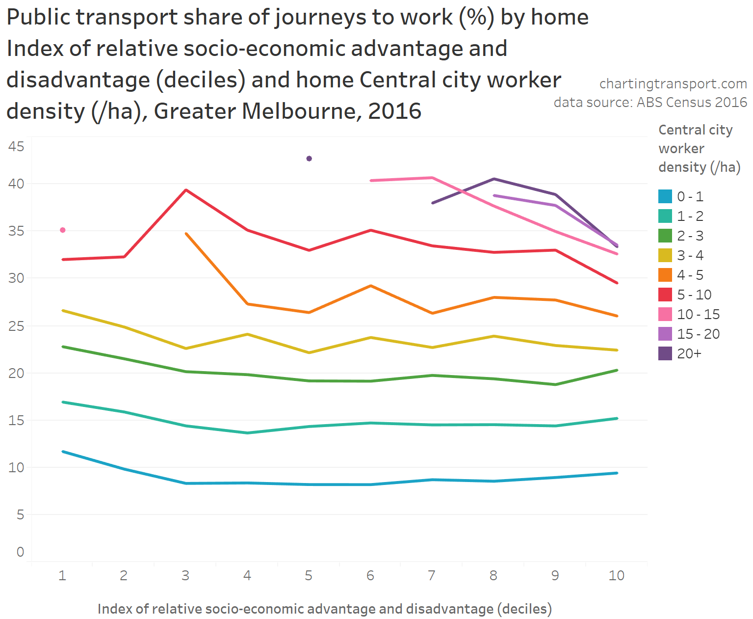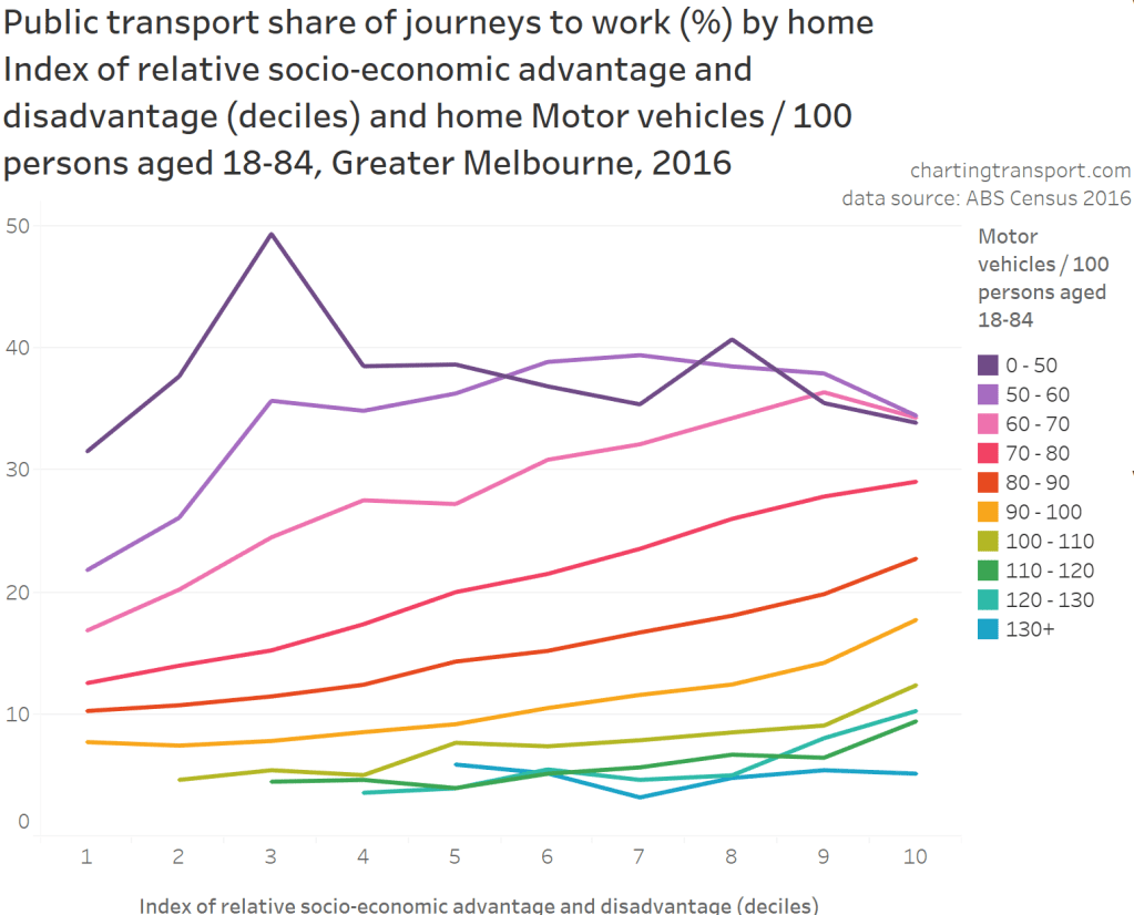 - There’s only so much you can do in the most socio-economically advantaged suburbs: Many cities have areas that are well served by rapid transit but still have high private transport mode shares. These tend to be some of the most advantaged suburbs, where many CBD workers are likely to be on high incomes and don’t wear the costs of private commuting. Shifting these commuters to public transport would probably require significant private transport disincentives.