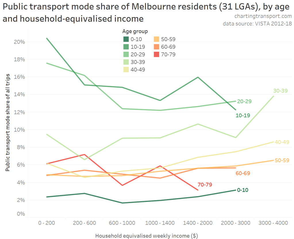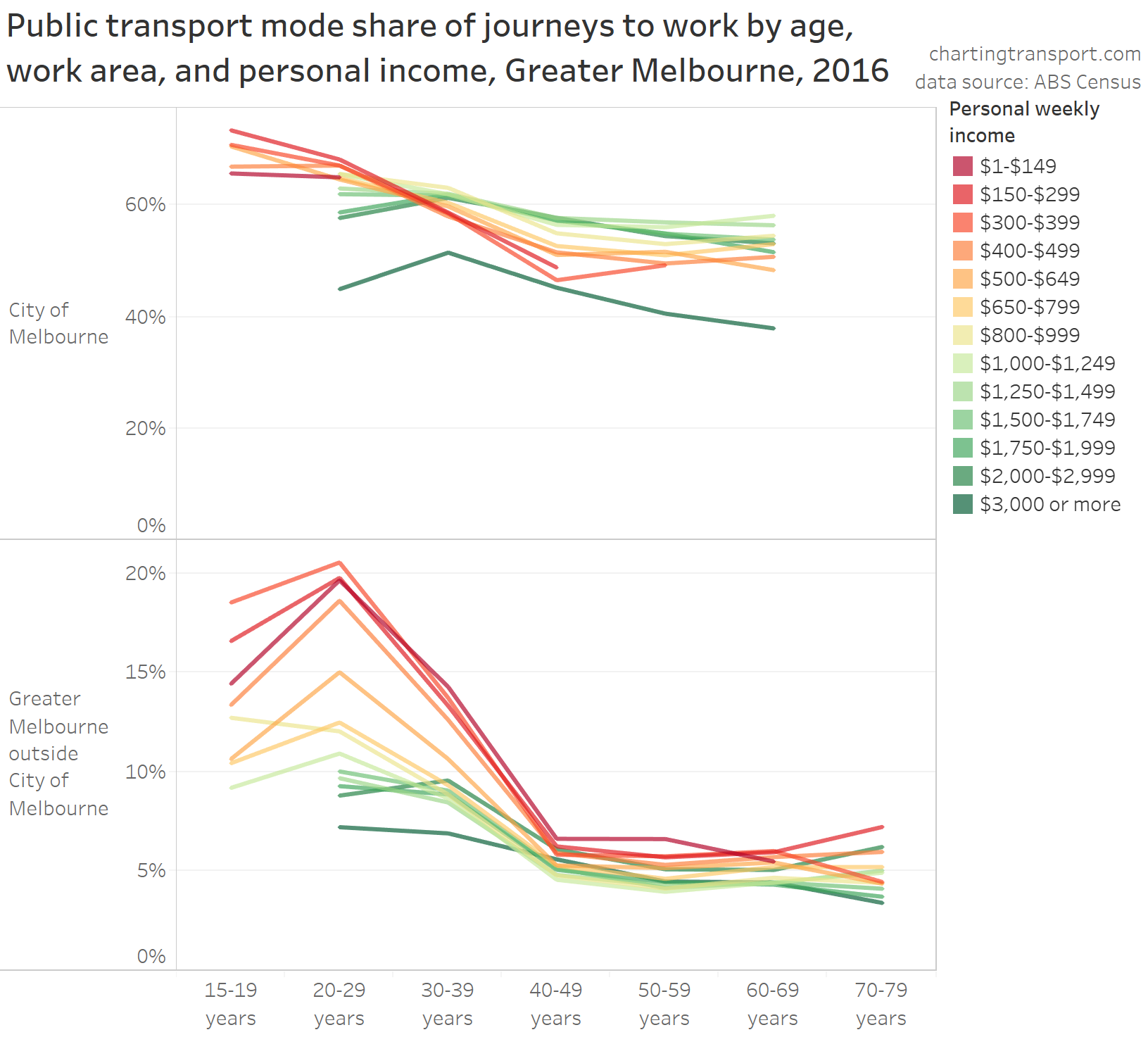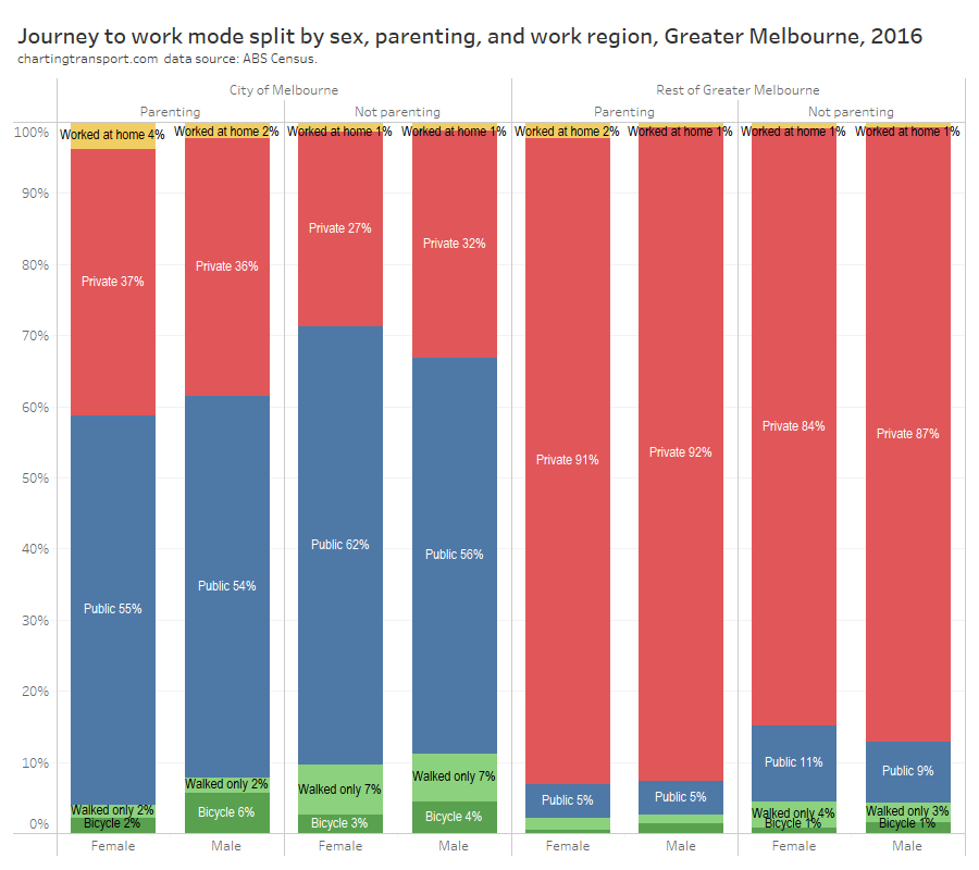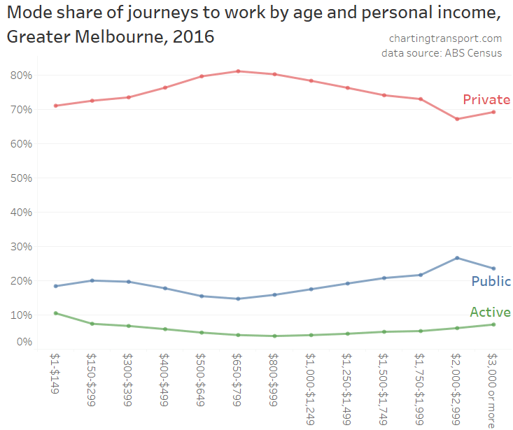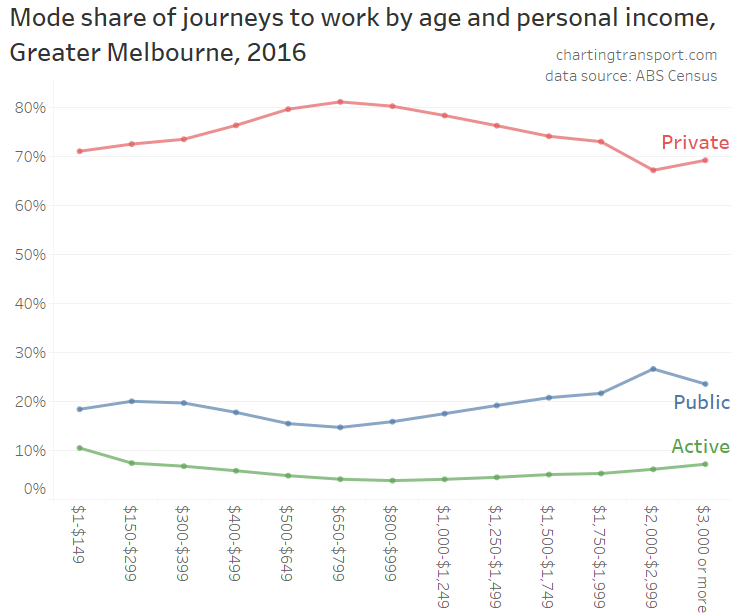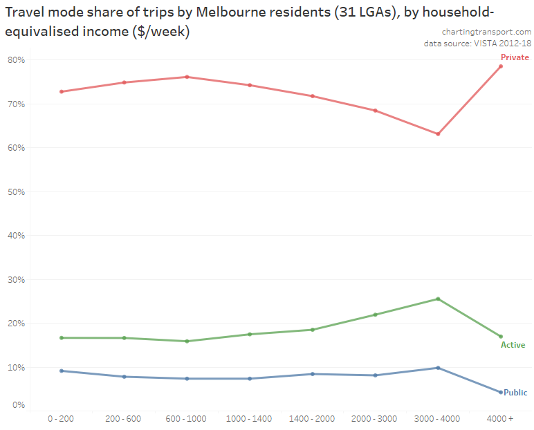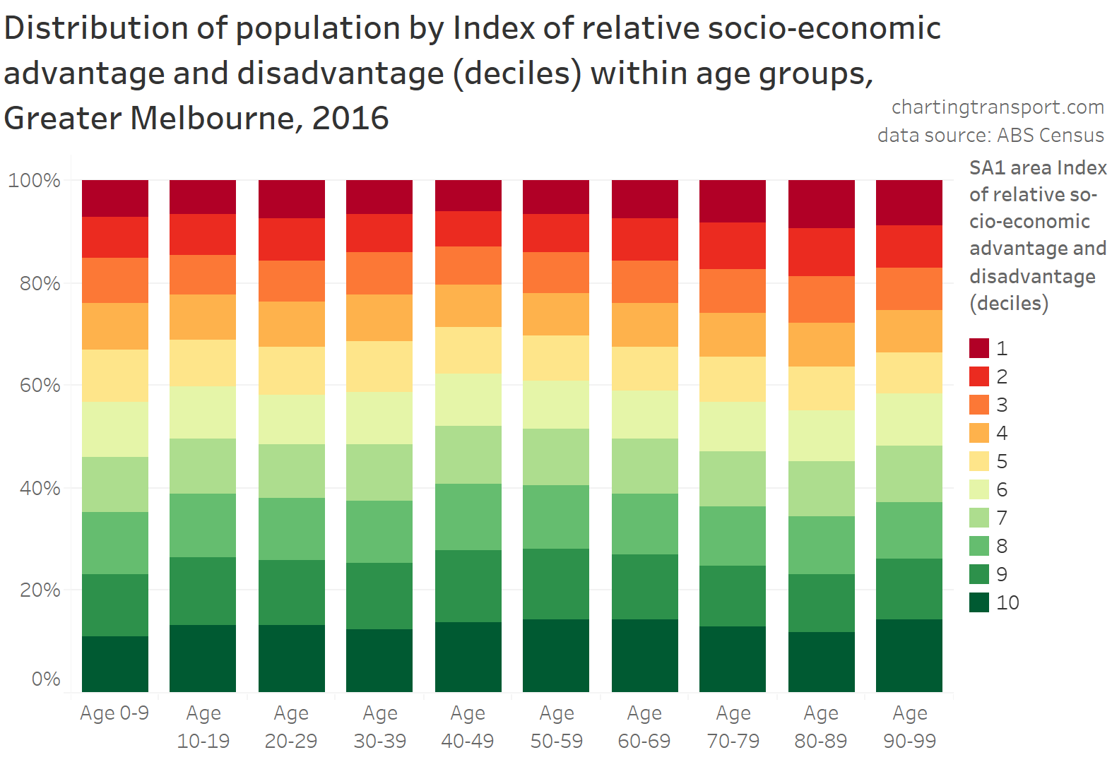 - There’s only so much you can do in the most socio-economically advantaged suburbs: Many cities have areas that are well served by rapid transit but still have high private transport mode shares. These tend to be some of the most advantaged suburbs, where many CBD workers are likely to be on high incomes and don’t wear the costs of private commuting. Shifting these commuters to public transport would probably require significant private transport disincentives.