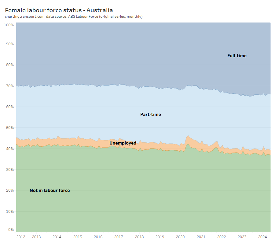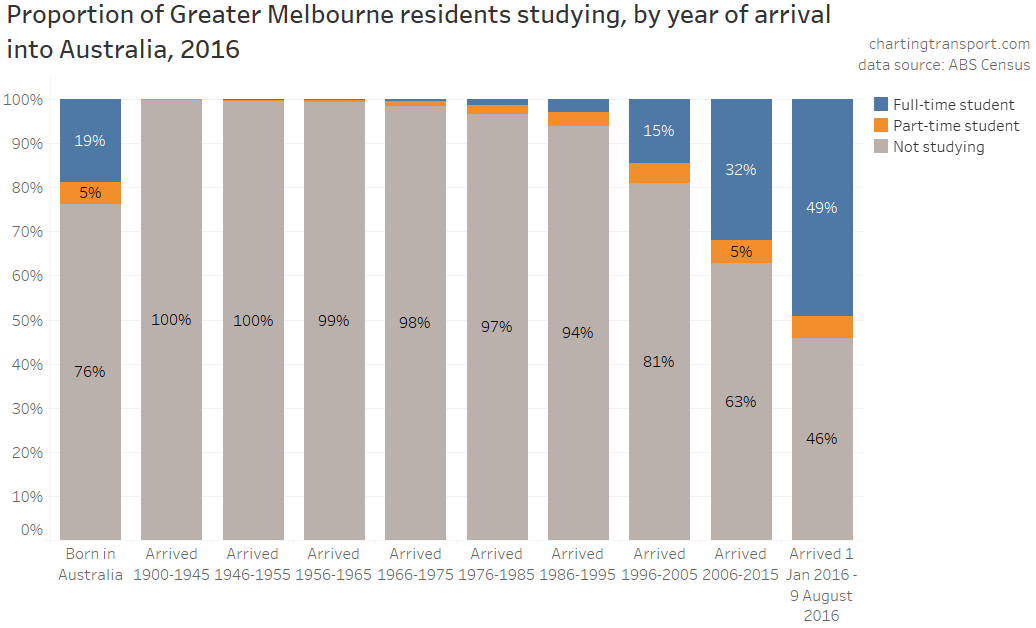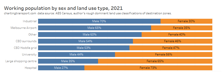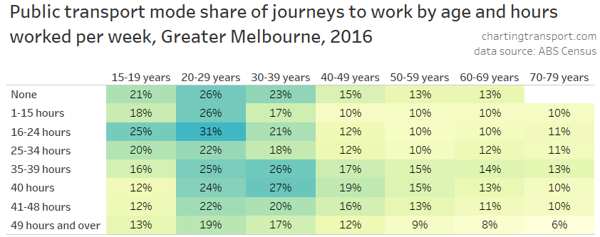 Note: the large green island to the north-east is Moreton Island, and it shares an SA2 with Scarborough and Newport on the mainland (very different areas!). I dare say there are unlikely to be many CBD commuters living on Moreton Island, and the 31% private mode share probably mostly reflects mainland commuters.
