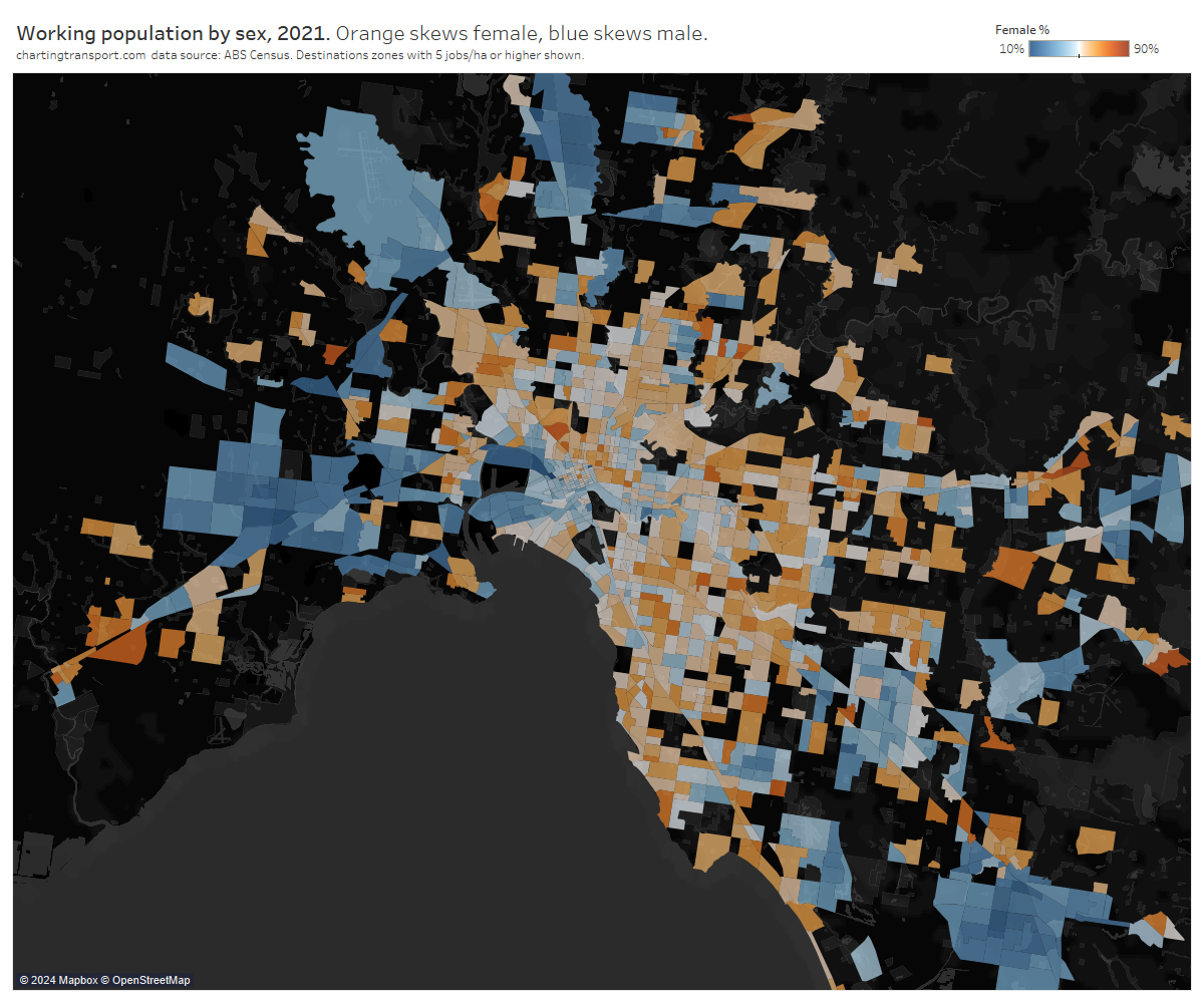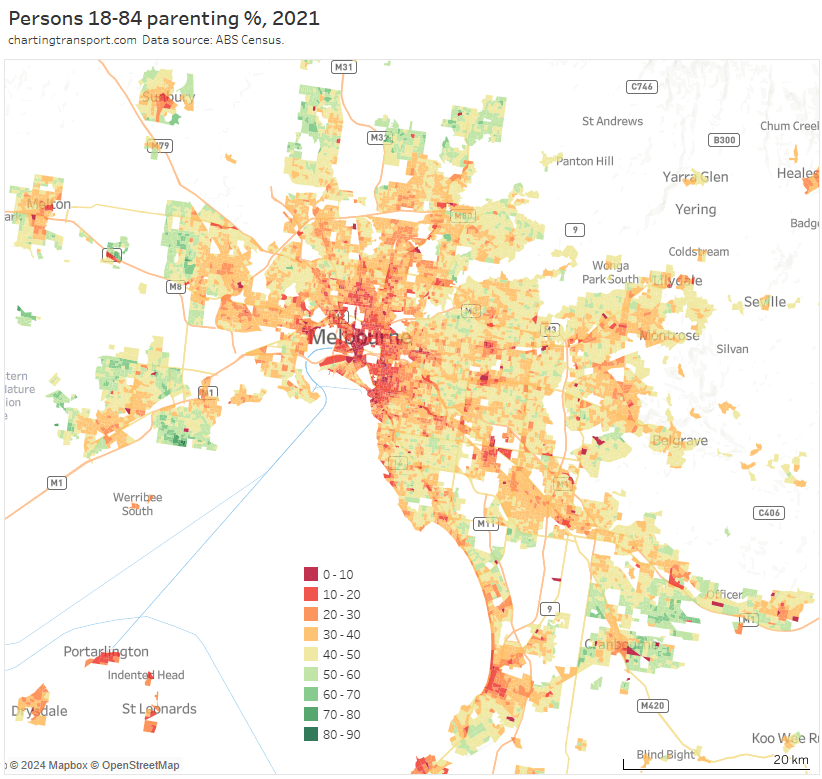 For the private transport volume and mode share map I’ve had to stretch the colour scale to max out at 60% to better differentiate the SA2s: