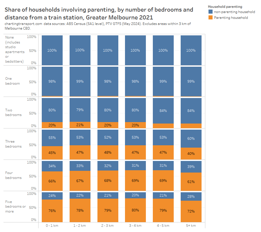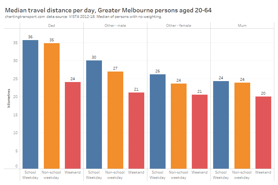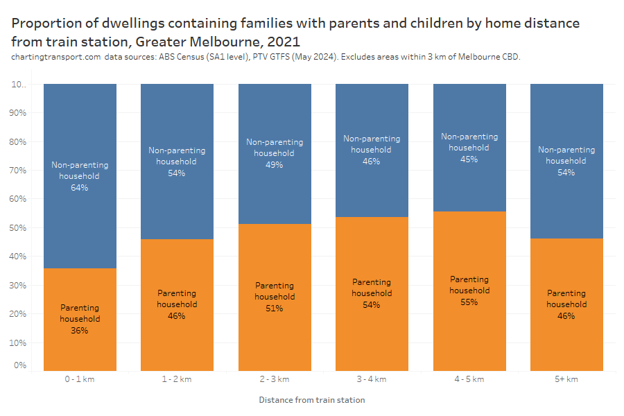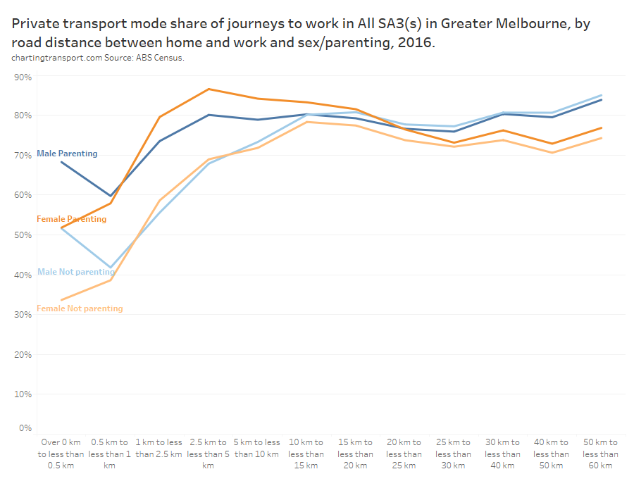 Private transport mode shares were often lower for suburbs further from CBDs, even those not adjacent to rapid transit stations. For these commuters park-and-ride or bus feeder travel to train lines is likely more competitive with driving. These commuters can often be less socio-economically advantaged – and so a long drive to expensive CBD parking each day would be a significant barrier. For many parts of Sydney and Melbourne, such longer distance car commutes might also pass through several motorway toll gates.
