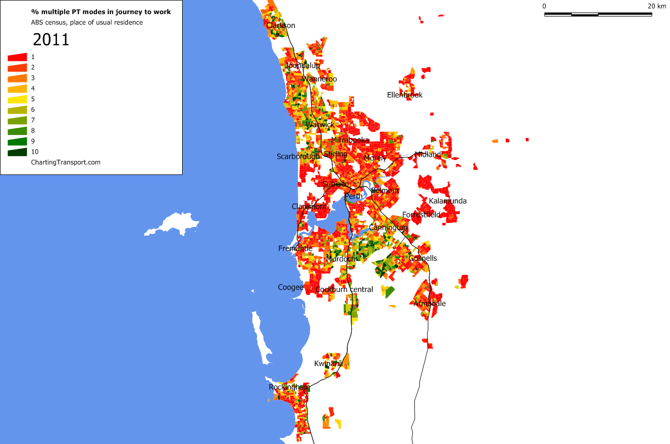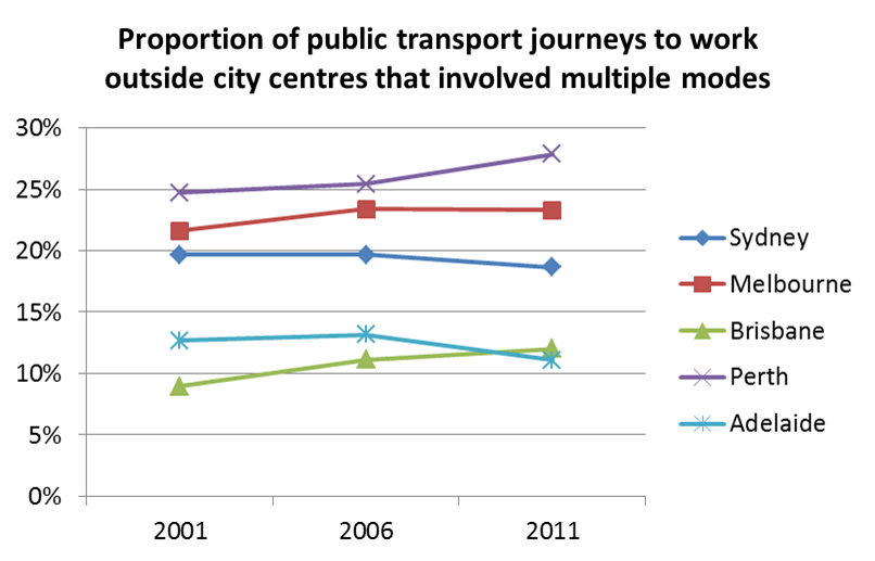 My last post looked at the overall trends in journeys to work in Melbourne, with a focus on public and private transport at the aggregate level. This post dives down to look at particular modes or modal combinations, including mode shares, mode shifts and the origins and destinations of new trips.