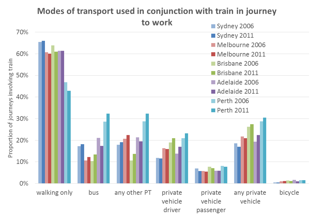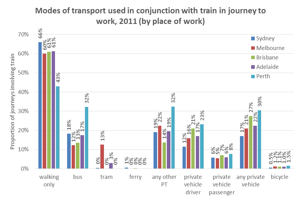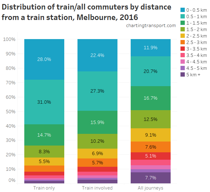 Interestingly, around a third of all Melbourne commuters lived within 1 km of a train station, but a majority of them did not actually report train as part of their journey to work.