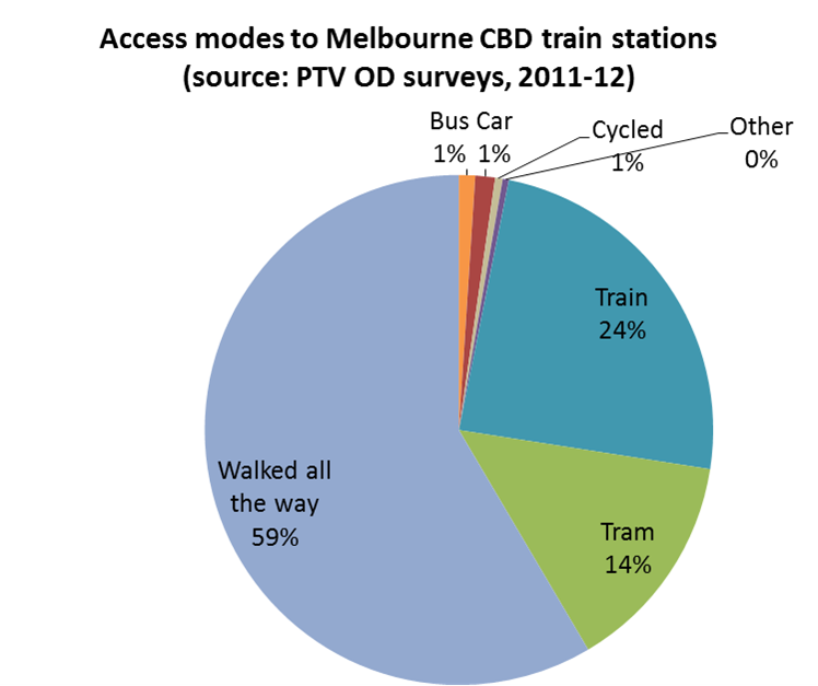 Train dominates most parts of Melbourne, with notable exceptions of the Manningham region (served by buses but not trains), several tram corridors that are remote from trains, and walking around the city centre.