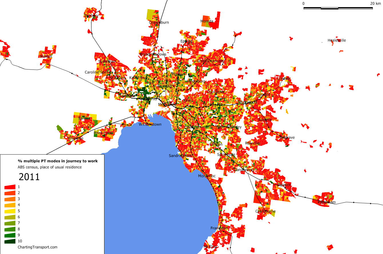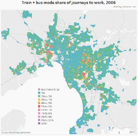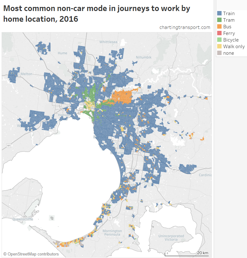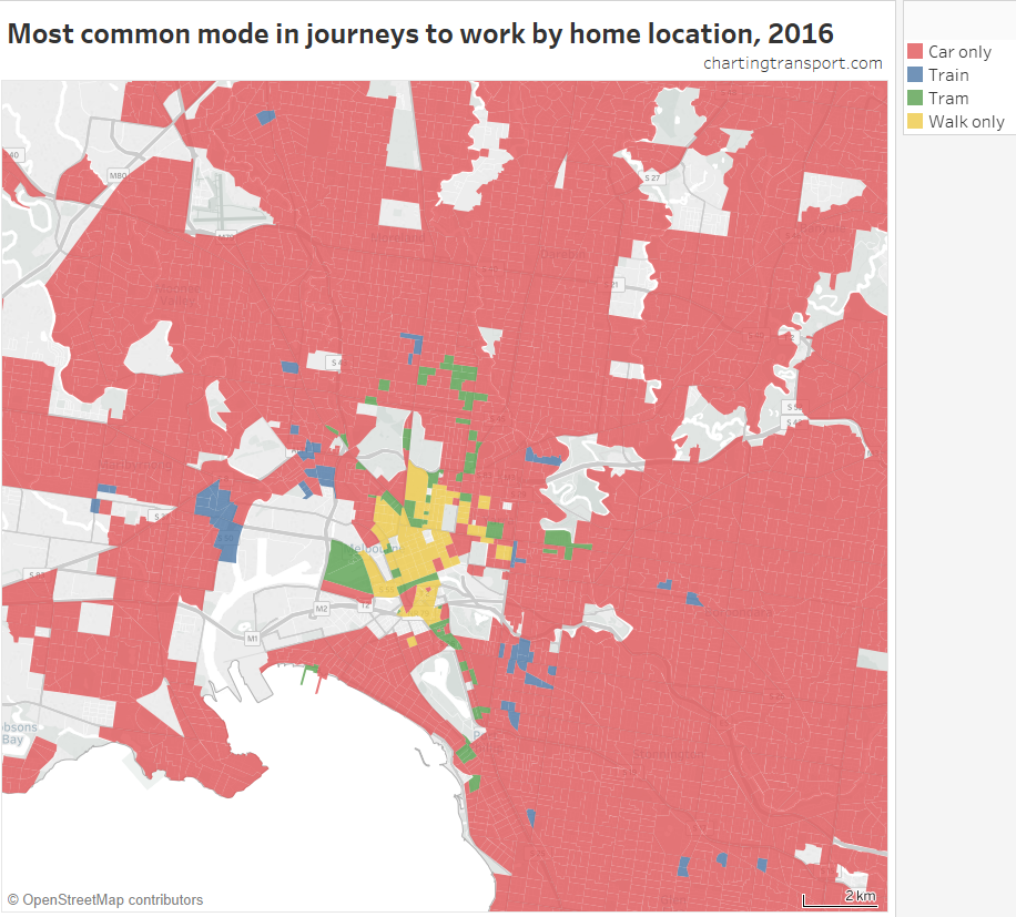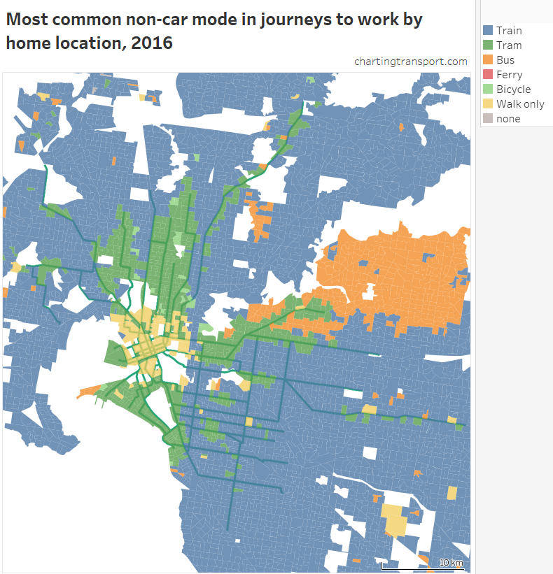In case you are wondering, there are places in Melbourne where train, tram, or walking-only trumped car-only as the most common mode. They are all on this map: