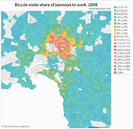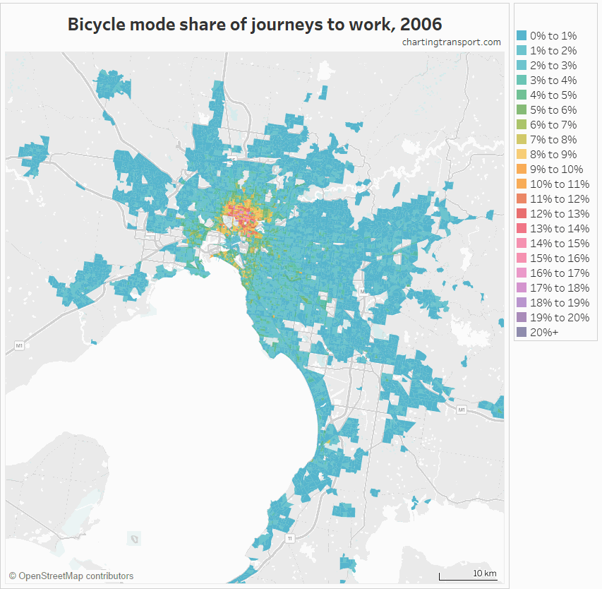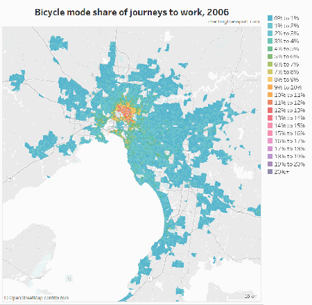 Cycling mode share increased from 1.5% in 2006 to 1.8% in 2011 and 1.9% in 2016. These are low numbers, but the bicycle mode share was anything but uniform across Melbourne.