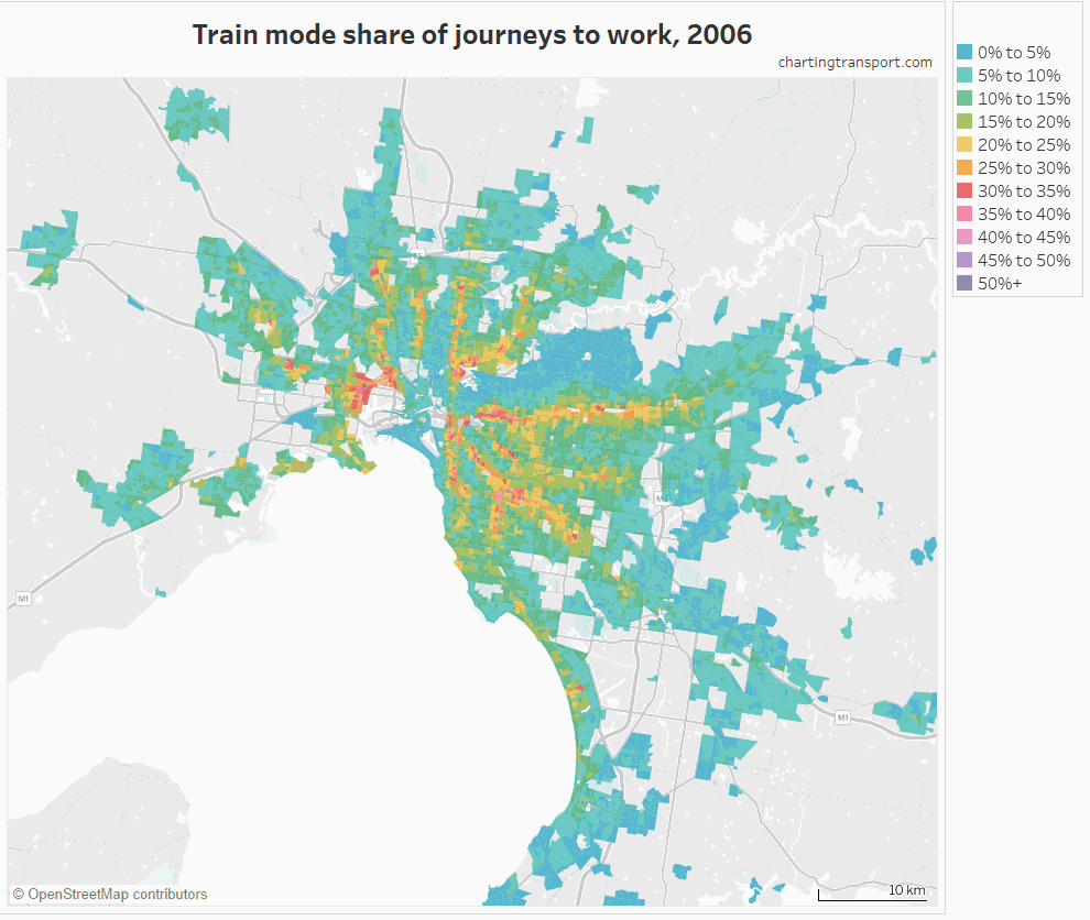 If you look closely, you’ll see higher shares in the Essendon – East Keilor corridor, where bus route 465 provides high peak frequencies meeting just about every train (service levels have not changed between 2006 and 2016)