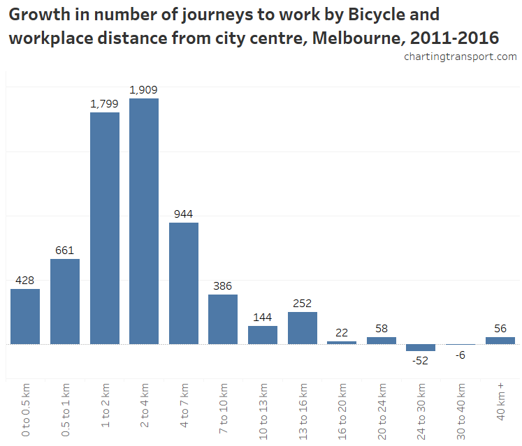 However if you look at the increase in bicycle commuter trips between 2011 and 2016 by workplace distance from the city, the biggest growth was for destinations 1-4 km from the city centre: