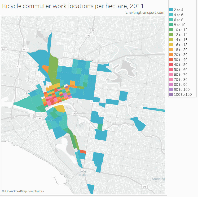 You’ll note the CBD does not have a high cycling mode share (3.8%) compared to the inner northern suburbs. But if you look at the concentration of cycling commuter workplaces, you get quite a different story:
