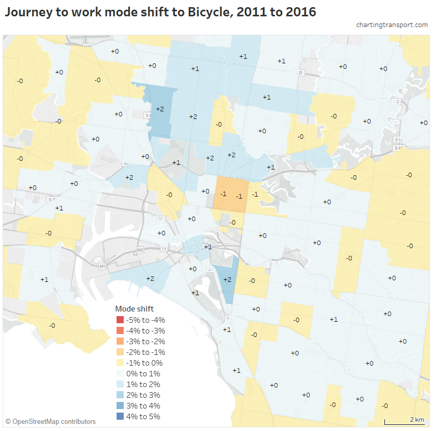 Here’s a map showing mode shift 2011 to 2016 at the SA2 level: