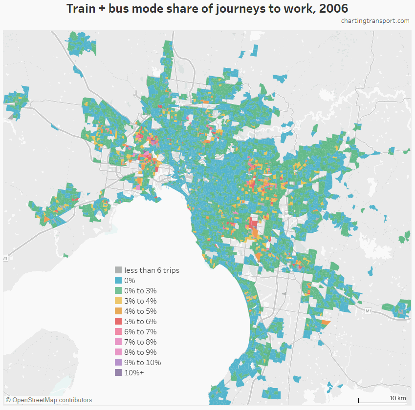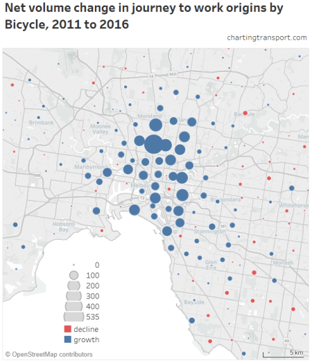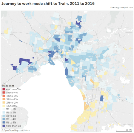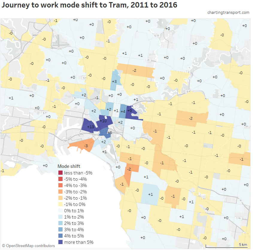The biggest mode shift were 2% in Brunswick West and South Yarra West. However aggregating to SA2 level hides some of the other changes. If you study the detailed map you can see larger mode shifts in more isolated pockets and/or corridors (including a corridor out through Footscray).