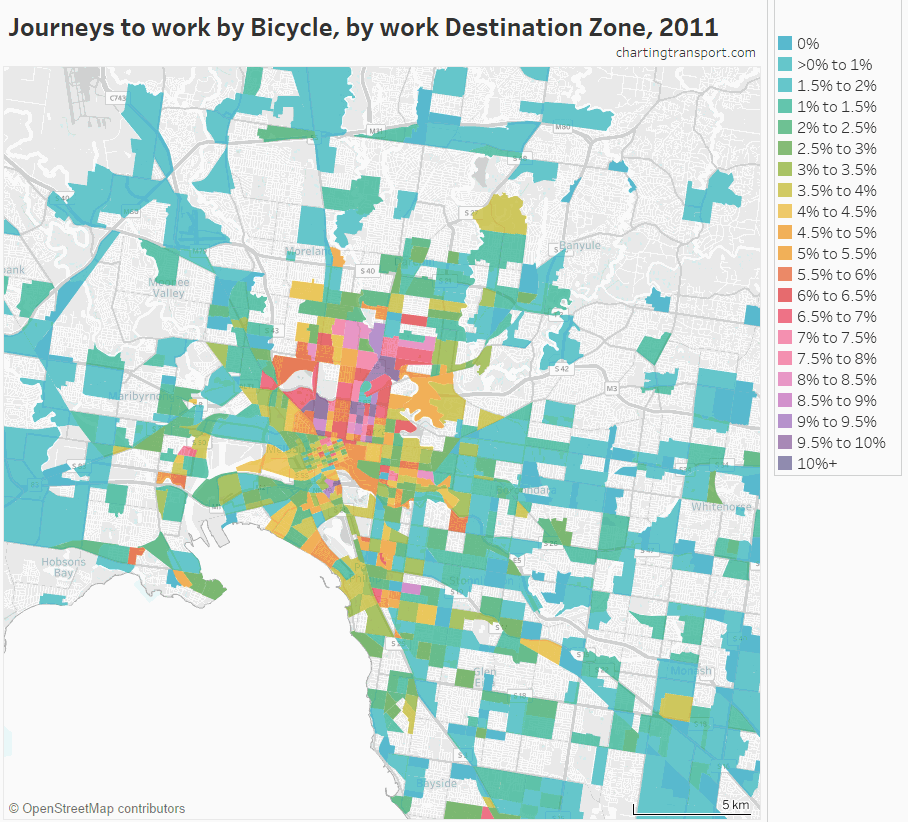 The highest mode shares are in the inner northern suburbs (pockets around 25%) where there has been considerable investment in cycling infrastructure.