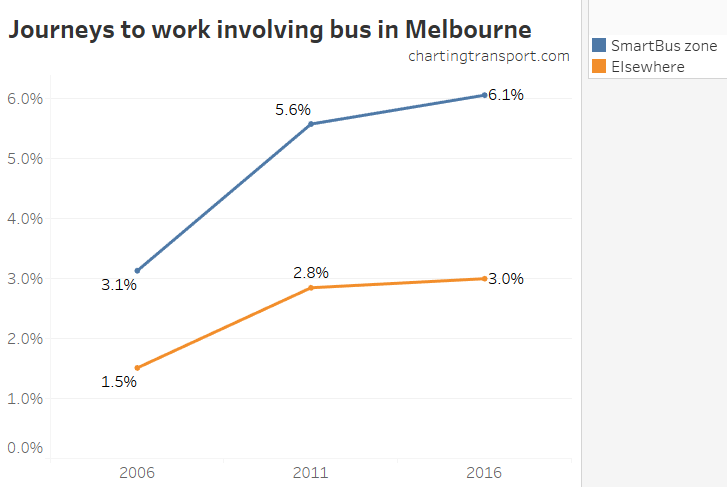 In 2006 the SmartBus zone already had double the bus mode share of the rest of Melbourne, as existing routes had relatively good service levels, including Eastern Freeway services. Following SmartBus (and other bus) upgrades between 2006 and 2011, there was a 2.5% mode shift to bus in the SmartBus zone, and a 1.3% mode shift to bus elsewhere. The SmartBus zone had a further 0.5% shift between 2011 and 2016 while the shift was only 0.2% in the rest of Melbourne.