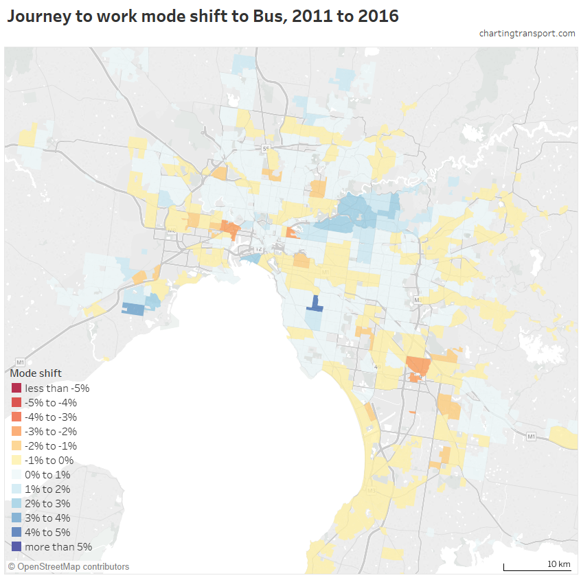 Outside the Kew – Doncaster corridor there were small mode shifts in pockets that received bus network upgrades between 2011 and 2016, including Point Cook, Craigieburn, Epping – West, Mernda, Port Melbourne, and Cairnlea.